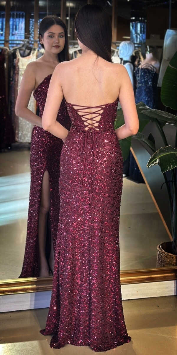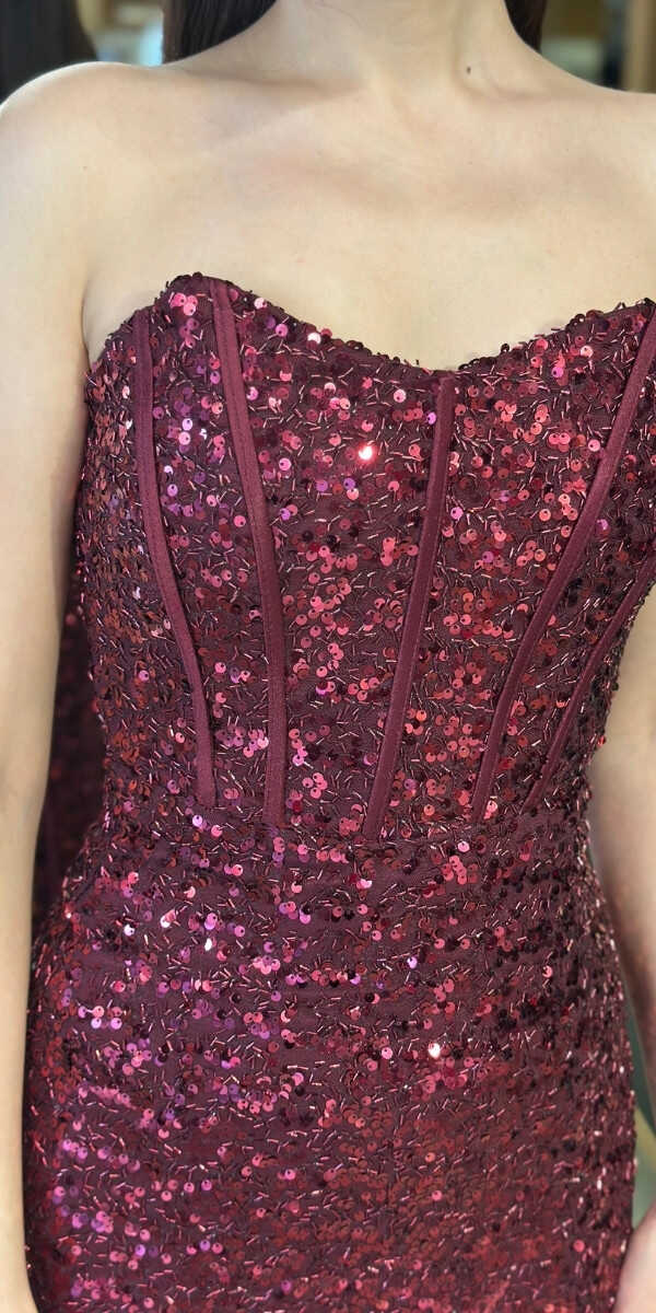 Straplez Yaka Bordo Renk Düz Kesim Uzun Abiye Elbise, Payet Kumaştan Üretilmiş olup Pırıltısıyla Göz Kamaştıracaktır. Şık Sırt Dekoltesi Size Çok Yakışacak. Yırtmaç Detayı Cesur ve Çarpıcı Bir Stil Sunacaktır.