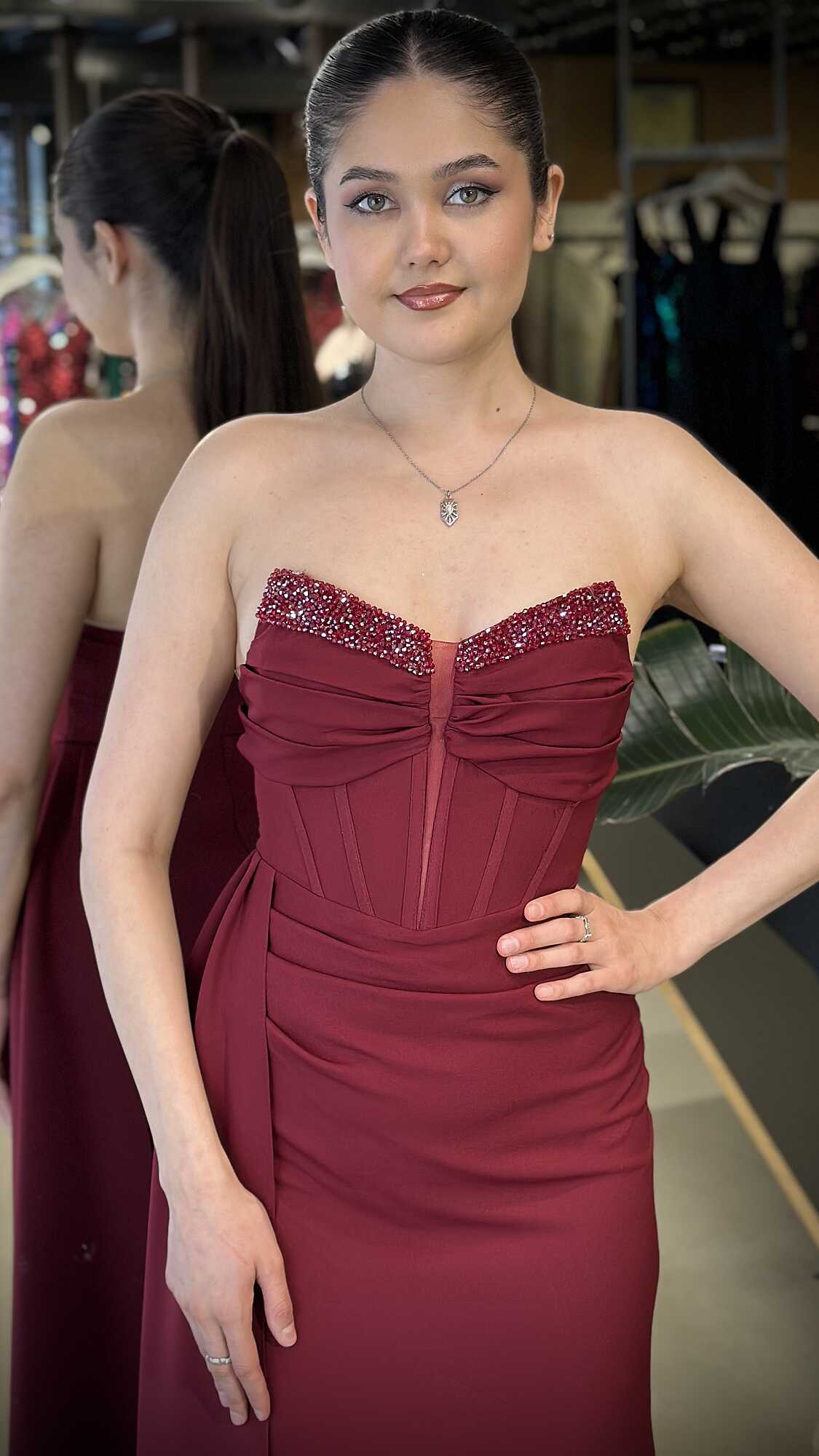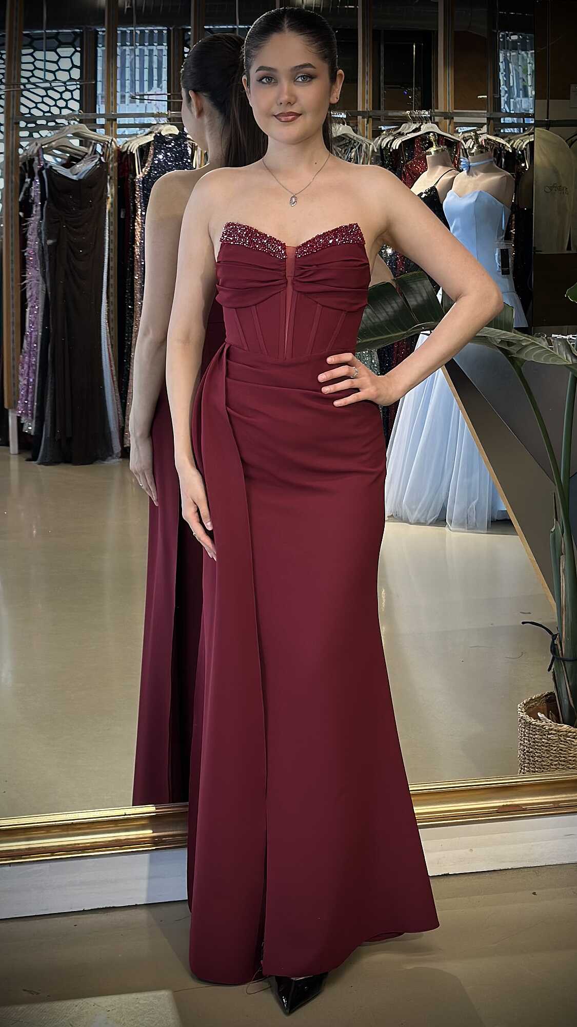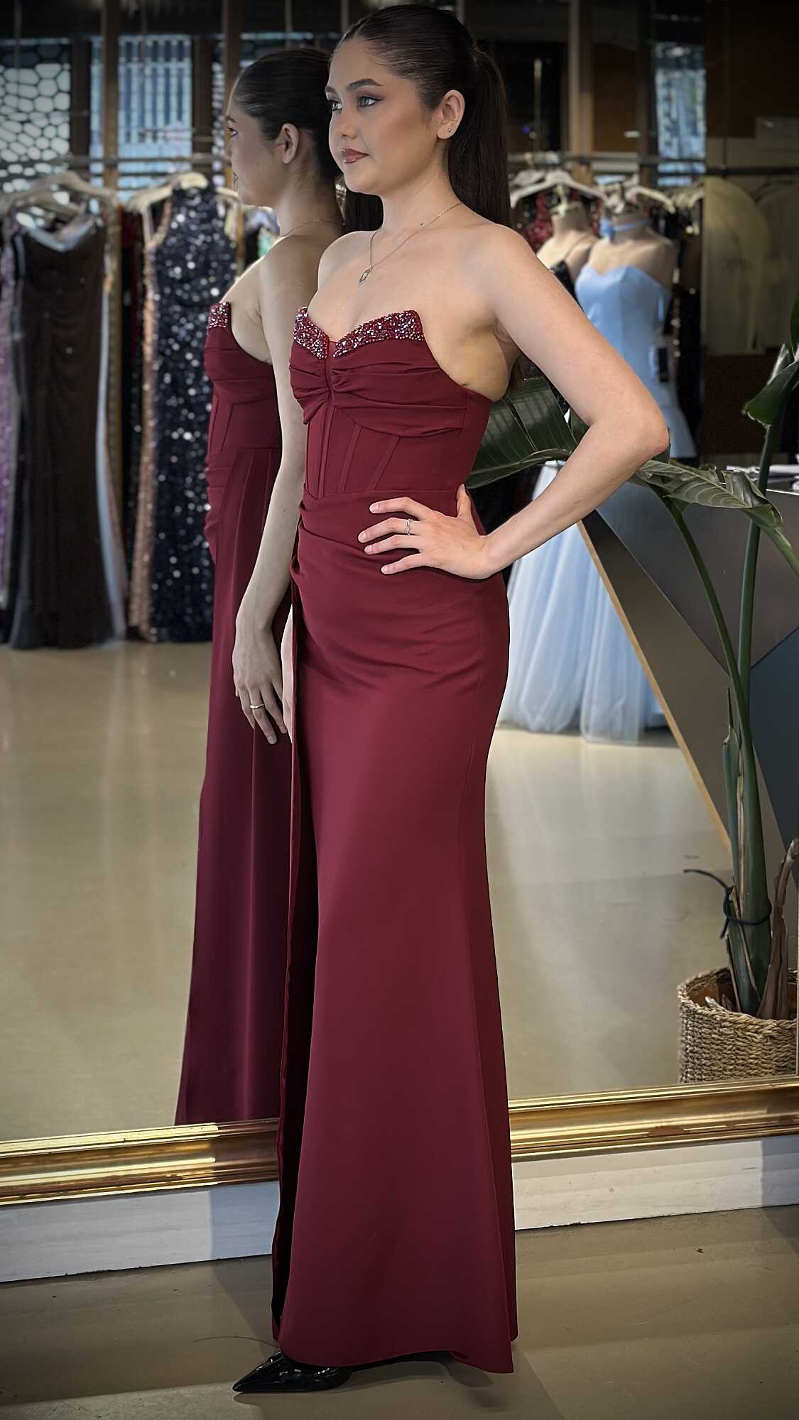 Gelince Haber VerStraplez Yaka BORDO Renk Düz Kesim Uzun Abiye Elbise, Krep Kumaştan Üretilmiş olup Hafif Ve Daha Az Kırışan Krep Kumaş Sizi Daha Rahat Hissettirecektir. Taşlı Aksesuar Dikkatleri Üzerinizde Toplayacak. Zarif göğüs dekoltesiyle dengeli bir çekicilik oluşturur. Adeta Göz Kamaştıran Bir Görünüm Yaratacak.