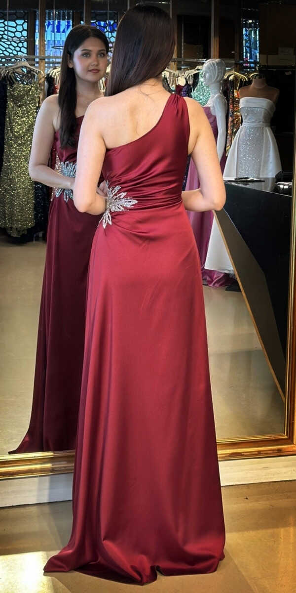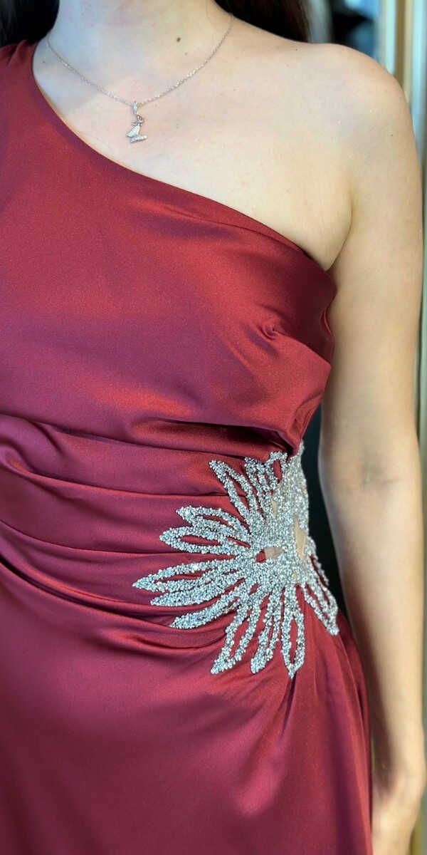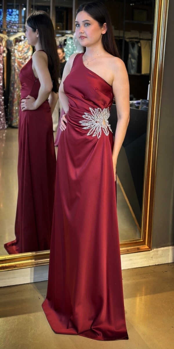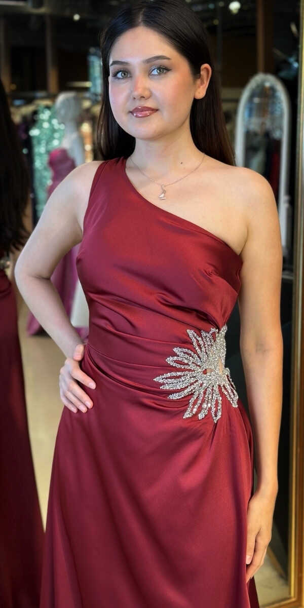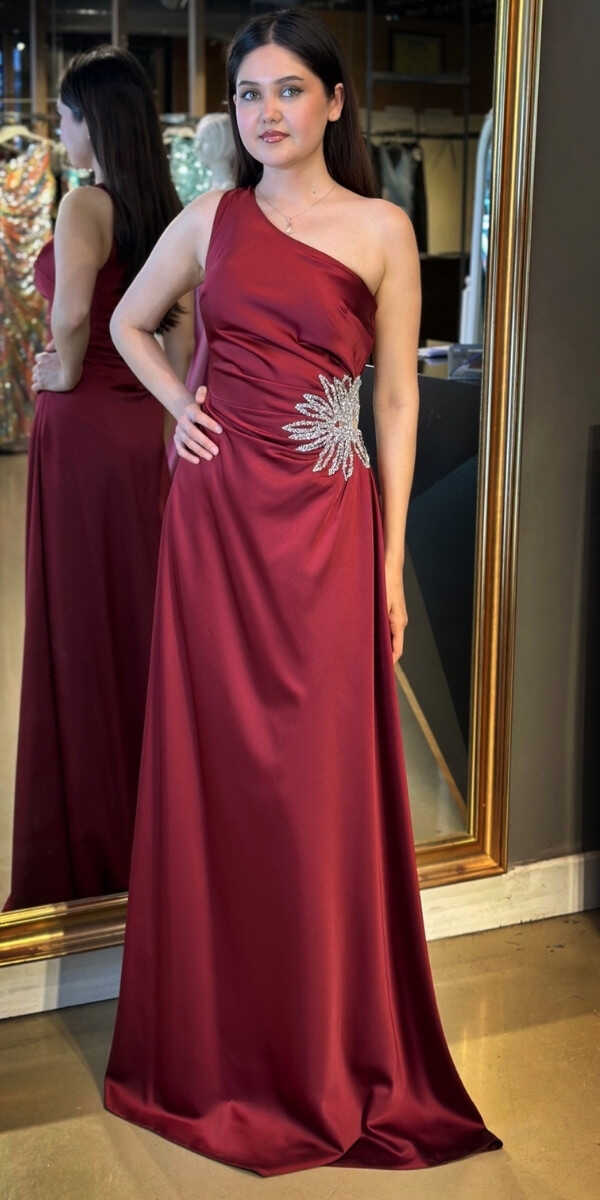 Bordo Renk Düz Kesim Uzun Abiye Elbise, Saten Kumaştan Üretilmiş olup Satenin Pürüzsüz Işığı Görünümünüze Zarafet Katacaktır. Taşlı Aksesuar Dikkatleri Üzerinizde Toplayacak.