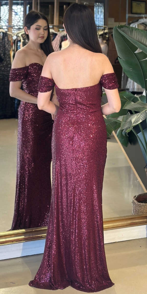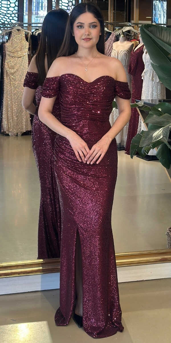 Bordo Yırtmaçlı Düz Kesim Payet Uzun Abiye Elbise 7379