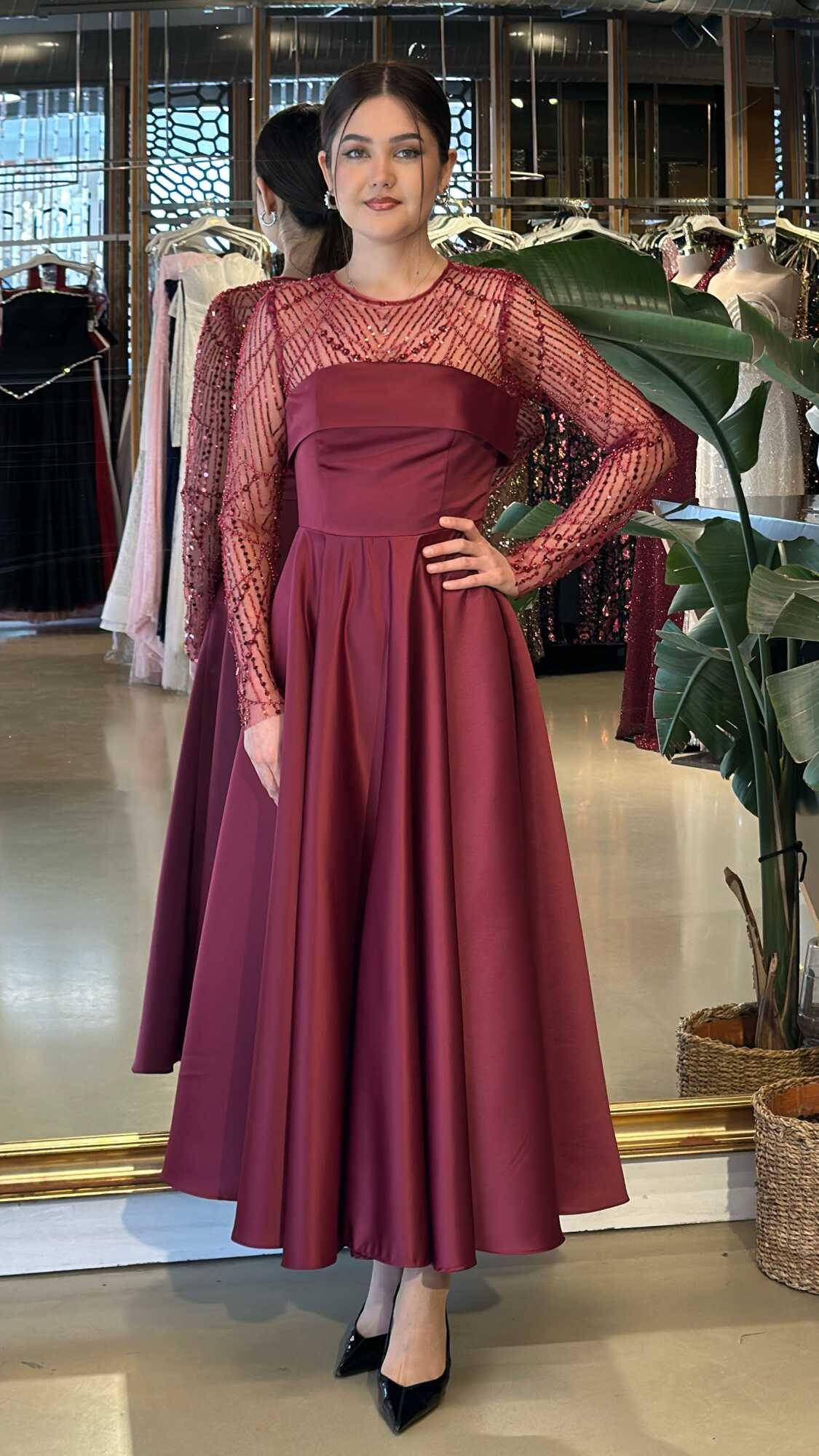 Yuvarlak Yaka Bordo Renk Kloş Etekli Midi Abiye Elbise, Saten Kumaştan Üretilmiş olup Satenin Pürüzsüz Işığı Görünümünüze Zarafet Katacaktır. Uzun kollarıyla, kollarınızı zarif bir şekilde kapatır.