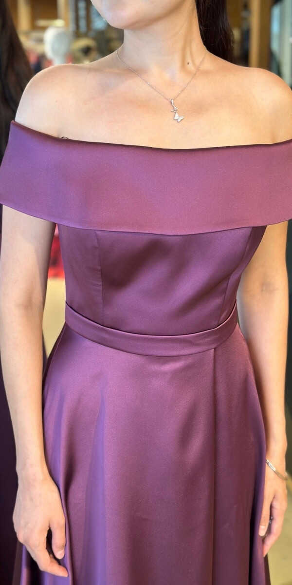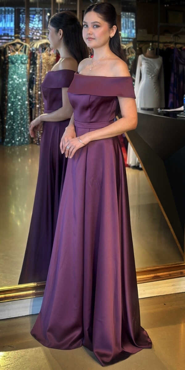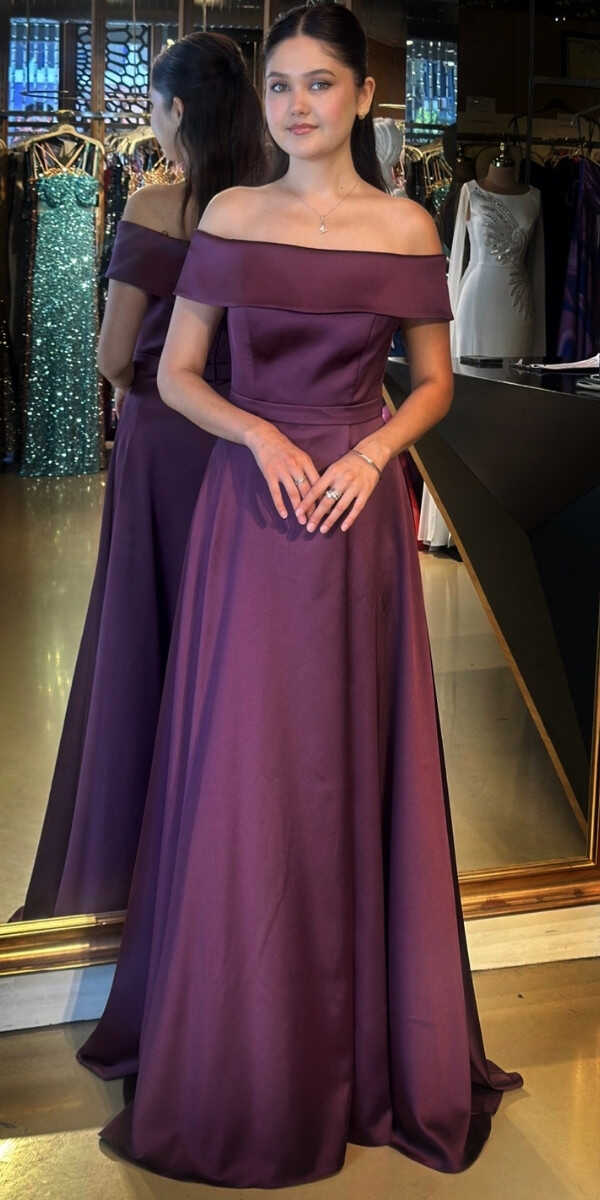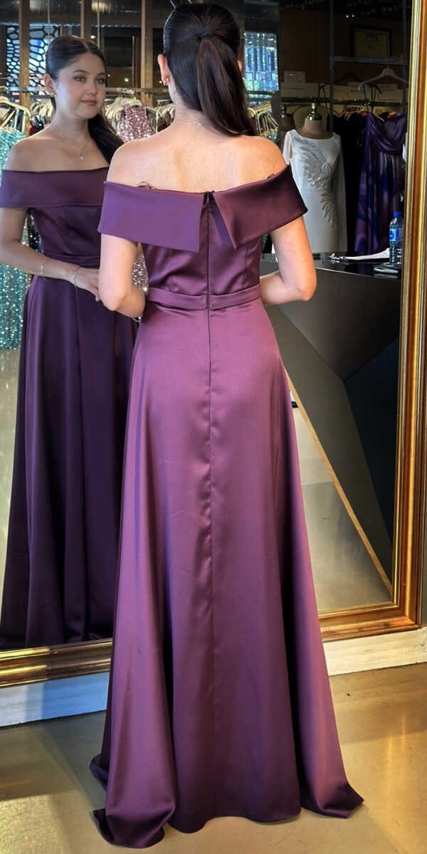 Damson Renk Kloş Etekli Uzun Abiye Elbise, Saten Kumaştan Üretilmiş olup Satenin Pürüzsüz Işığı Görünümünüze Zarafet Katacaktır.