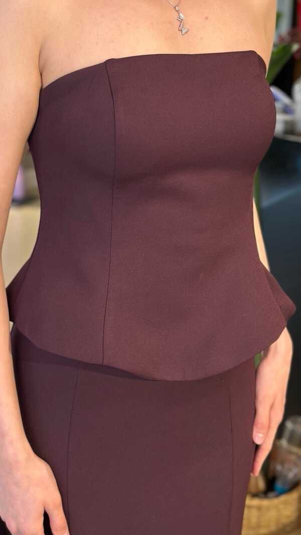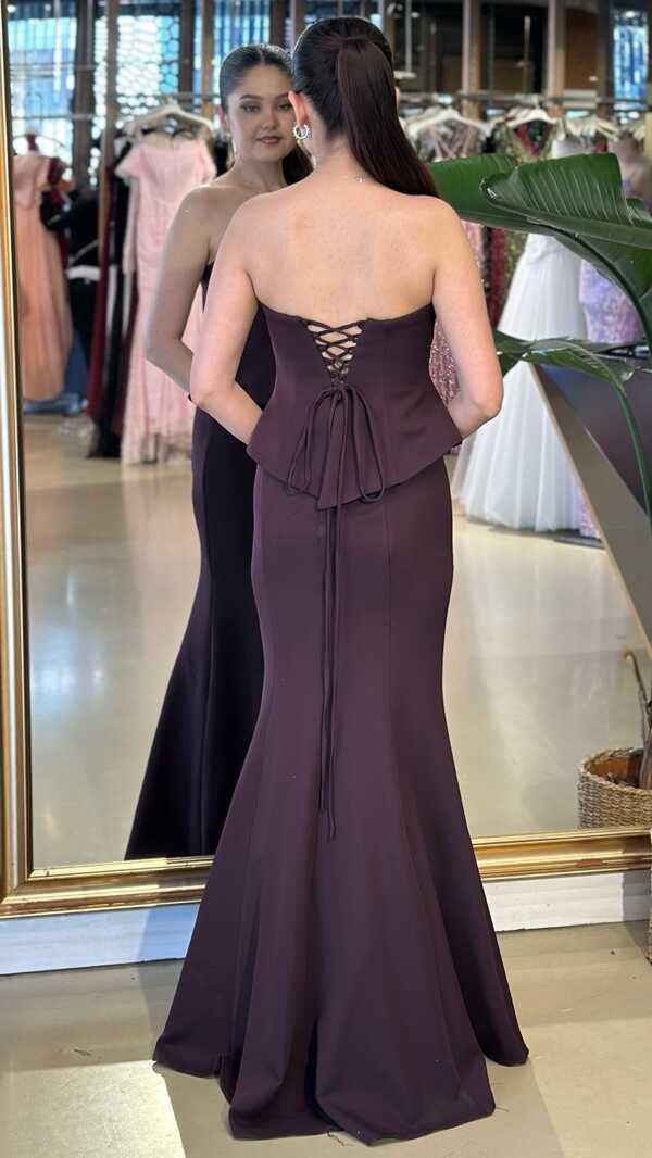 Straplez Yaka Damson Renk Balık Etekli Uzun Abiye Elbise, Krep Kumaştan Üretilmiş olup Hafif Ve Daha Az Kırışan Krep Kumaş Sizi Daha Rahat Hissettirecektir.