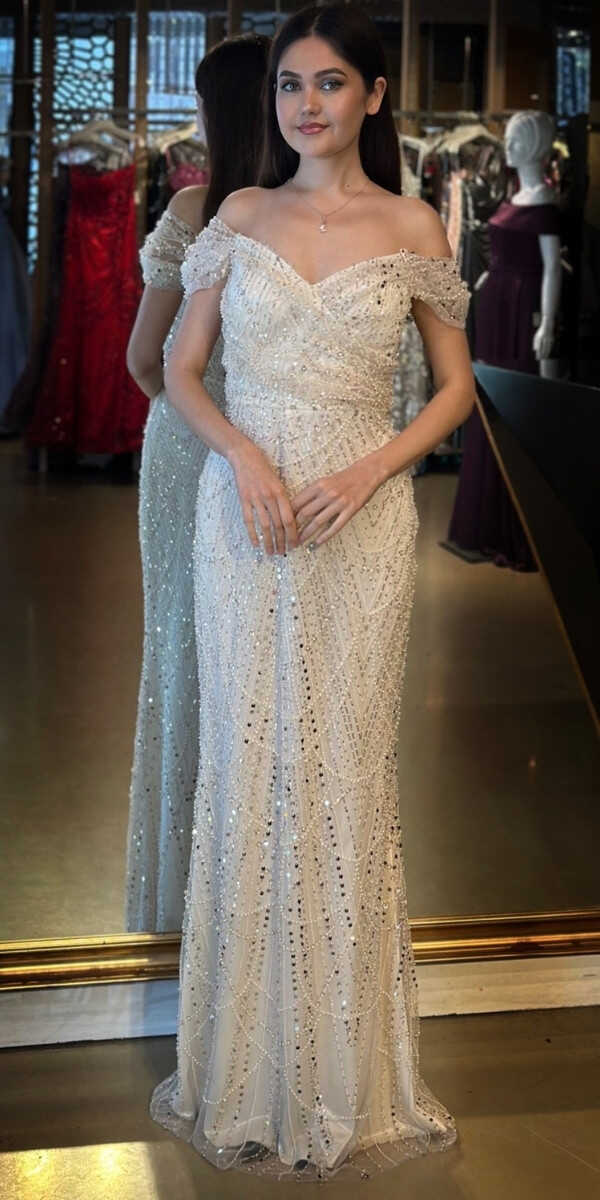 Ekru Renk Düz Kesim Uzun Abiye Elbise, Pullu Boncuklu Kumaştan Üretilmiş olup Parıltı ve Zarafetin Buluştuğu Kumaş Türü Sizi Işıl Işıl Gösterecektir. Şık Sırt Dekoltesi Size Çok Yakışacak.