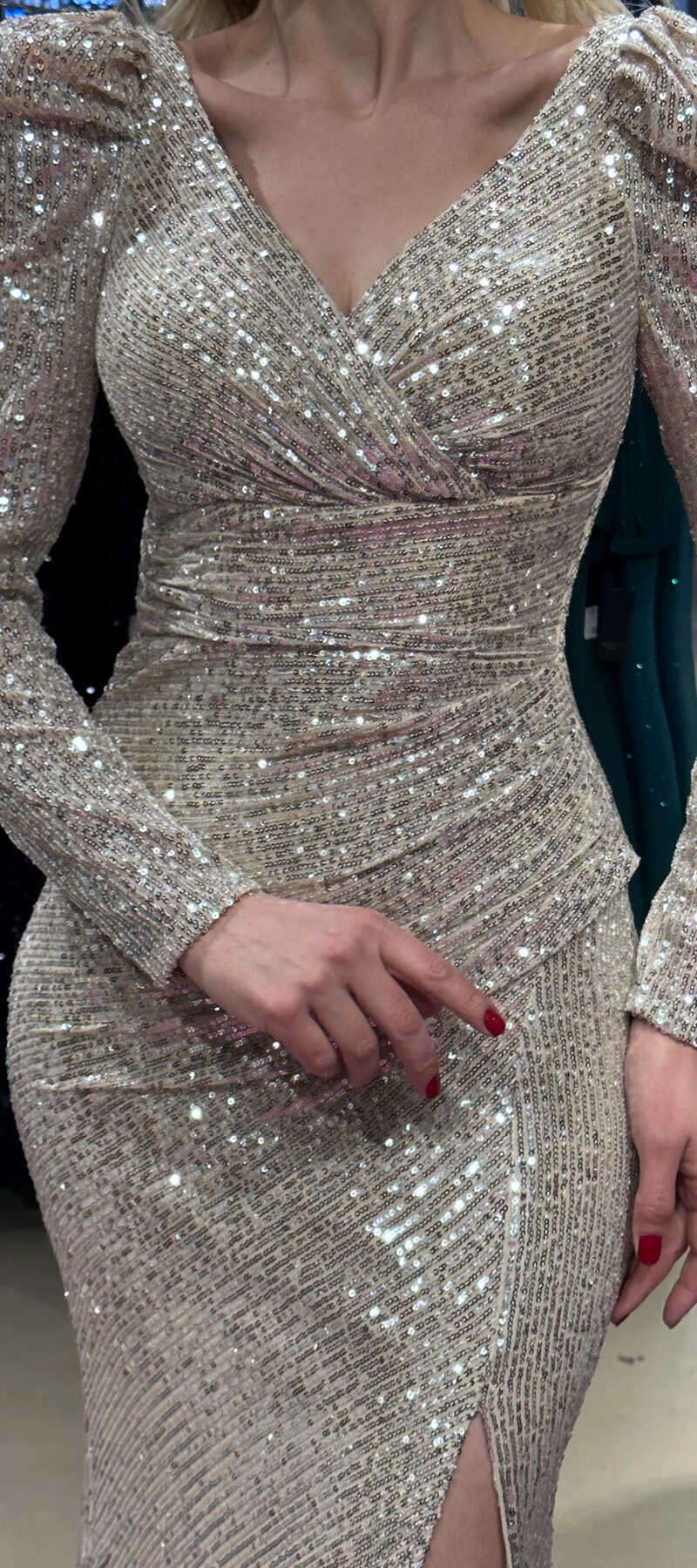 Beige Color Straight Cut, Long Evening Dress, Has Been Produced From Sequin Fabric. Slit Detail Will Present A Brave And Striking Style. It Will Dazzle With Its Sparkle.