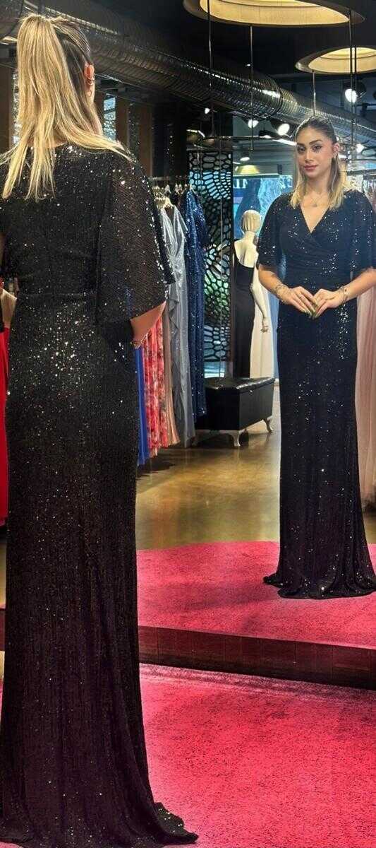 Black Color Straight Cut, Long Evening Dress, Has Been Produced From Sequin Fabric. It Will Dazzle With Its Sparkle.
