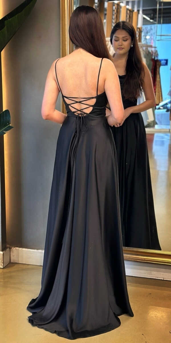 Black Color Flared Skirt, Long Evening Dress, Has Been Produced From Satin Fabric. Rope Hangers On The Dress Will Create Ease Of Use. Slit Detail Will Present A Brave And Striking Style. The Smooth Light Of Satin Will Add Elegance To Your Look.