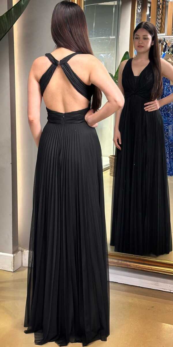 Black Color Flared Skirt, Long Evening Dress, Has Been Produced From Fabric. Stylish Low-Cut Back Dress Will Look Great On You.