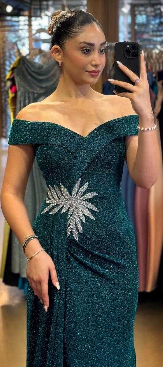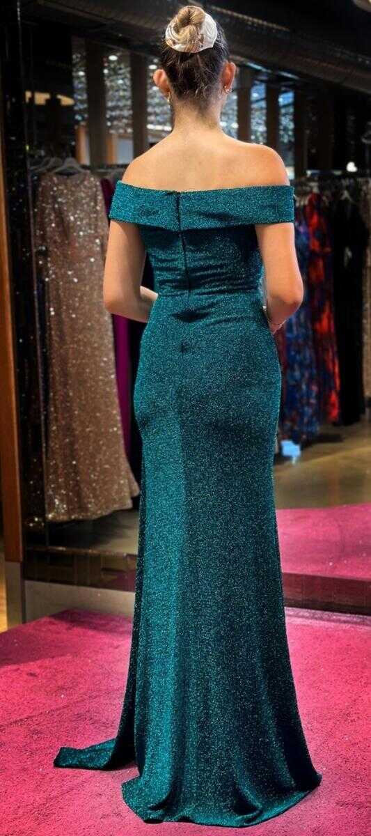 Black Turquoise Color Straight Cut, Long Evening Dress, Has Been Produced From Glitter Fabric. Stone Accessory Will Gather Attention On You. Slit Detail Will Present A Brave And Striking Style. You Will Look Very Beautiful With The Sparkle Of Glitter.
