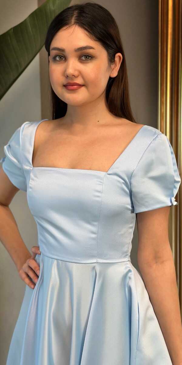 Blue Color Flared Skirt, Midi Evening Dress, Has Been Produced From Satin Fabric. The Smooth Light Of Satin Will Add Elegance To Your Look.