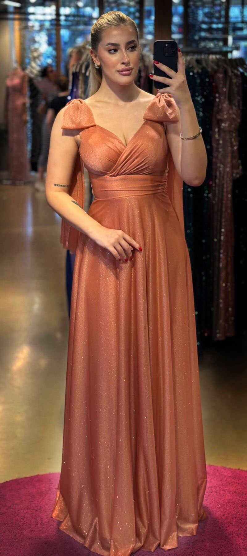 Copper Color Flared Skirt, Long Evening Dress, Has Been Produced From Glitter Fabric.