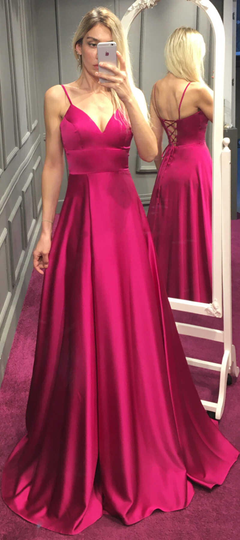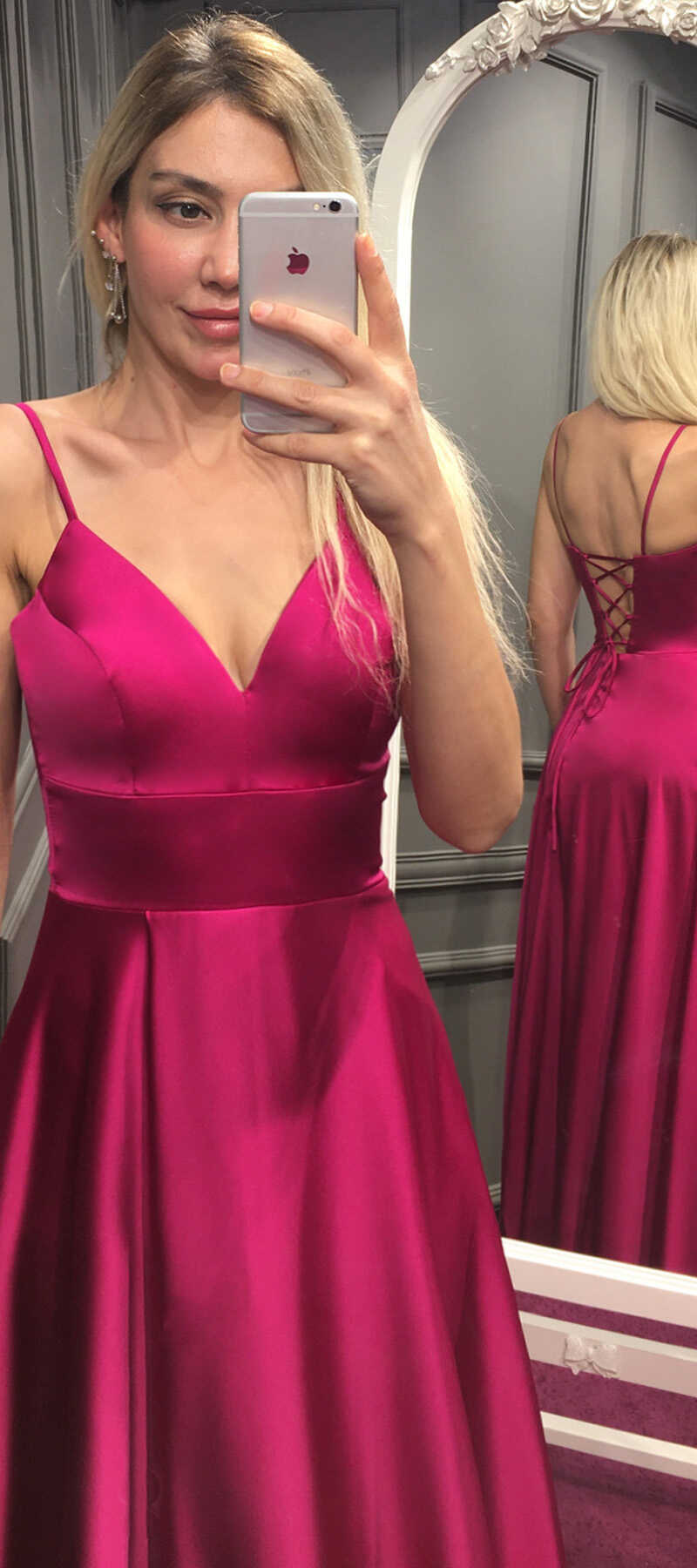 Fuchsia Color Flared Skirt, Long Evening Dress, Has Been Produced From Satin Fabric. Rope Hangers On The Dress Will Create Ease Of Use. Stylish Low-Cut Back Dress Will Look Great On You. It Will Create A Dazzling Look. The Smooth Light Of Satin Will Add Elegance To Your Look.