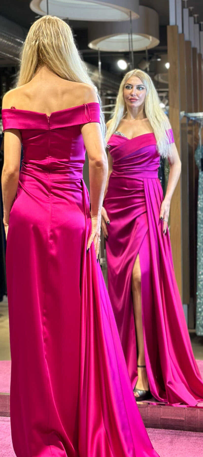 Fuchsia Color Straight Cut, Long Evening Dress, Has Been Produced From Satin Fabric. Stone Accessory Will Gather Attention On You. Slit Detail Will Present A Brave And Striking Style. The Smooth Light Of Satin Will Add Elegance To Your Look.
