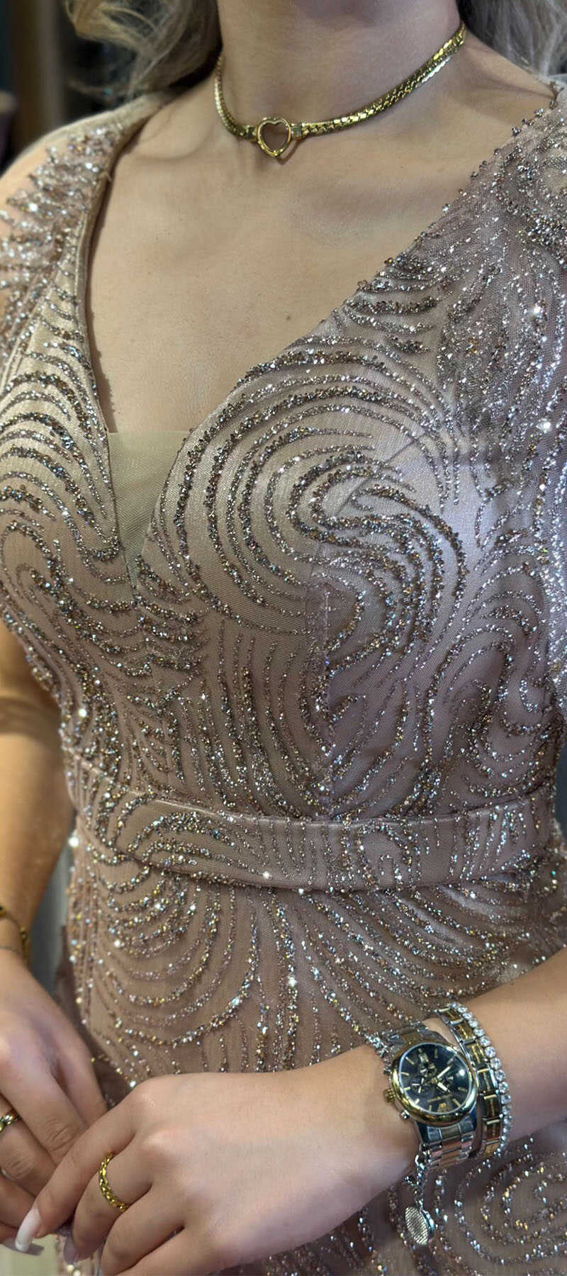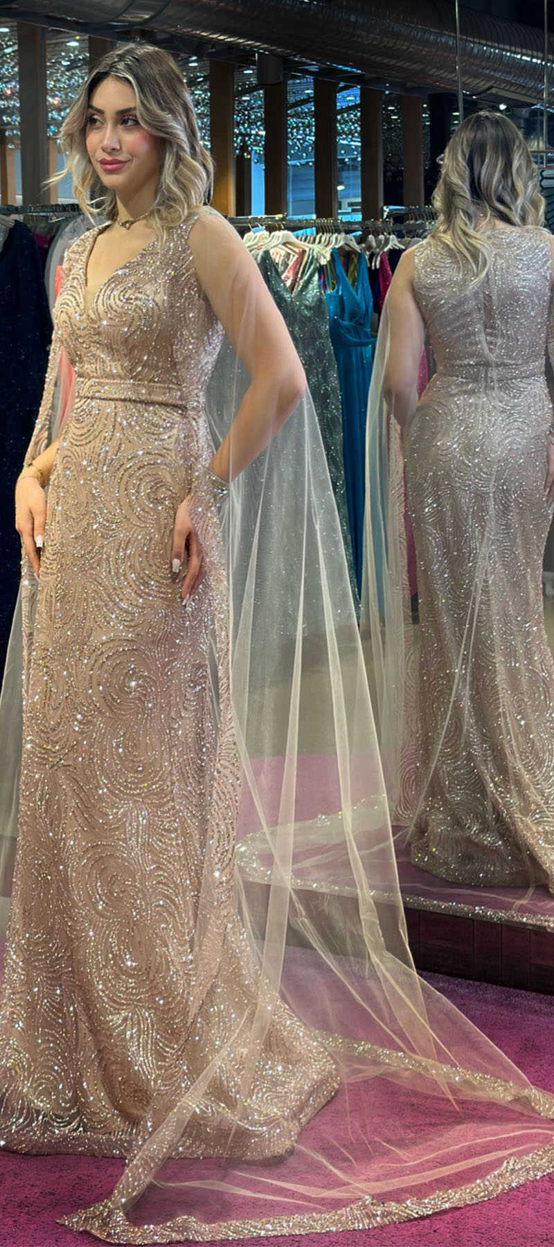 Gold Color Straight Cut, Long Evening Dress, Has Been Produced From Glitter Fabric. You Will Look Very Beautiful With The Sparkle Of Glitter.