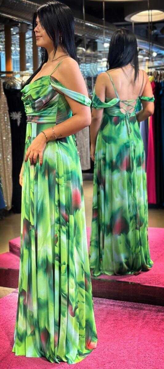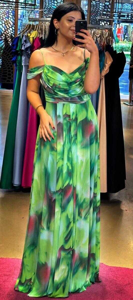 Green Color Flared Skirt, Long Evening Dress, Has Been Produced From Patterned Fabric. Rope Hangers On The Dress Will Create Ease Of Use. Stylish Low-Cut Back Dress Will Look Great On You. It Will Be Indispensable For Your Beach And Countryside Weddings.