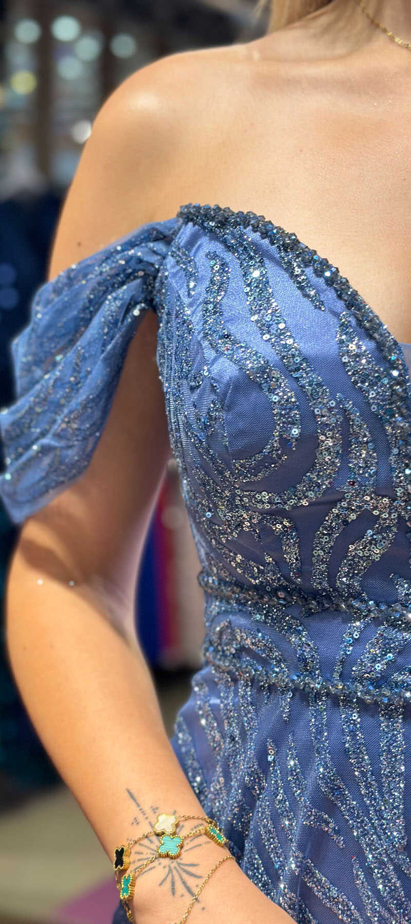Indigo Low Sleeve Beaded Flared Skirt Glitter Long Evening Dress 7547