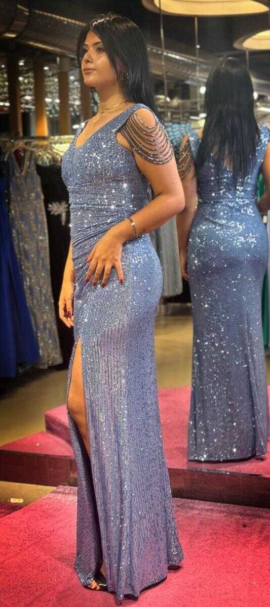 Indigo Color Straight Cut, Long Evening Dress, Has Been Produced From Sequin Fabric. Slit Detail Will Present A Brave And Striking Style. It Will Dazzle With Its Sparkle.