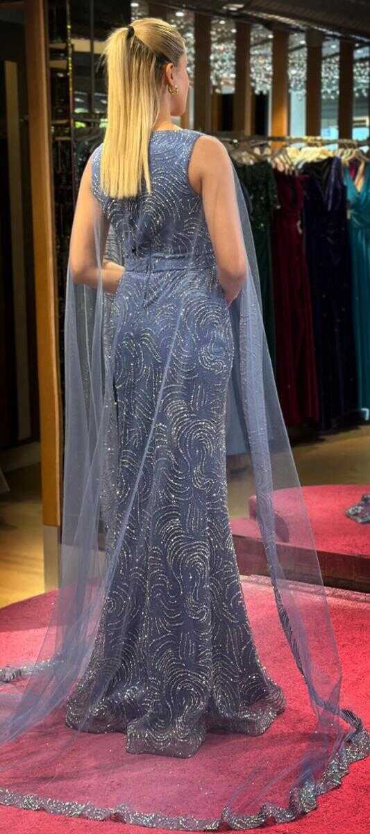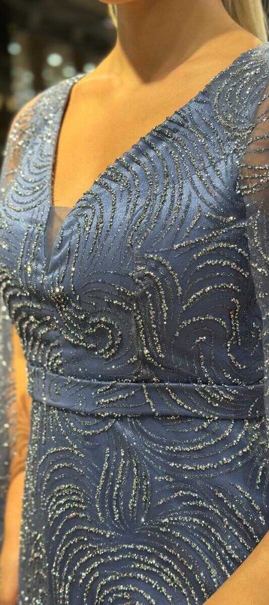 Indigo Color Straight Cut, Long Evening Dress, Has Been Produced From Glitter Fabric. You Will Look Very Beautiful With The Sparkle Of Glitter.