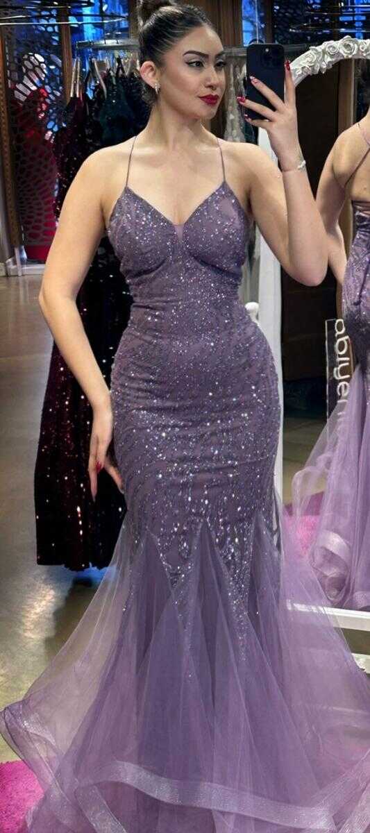 Lavender Color Mermaid Skirt, Long Evening Dress, Has Been Produced From Glitter Fabric. Rope Hangers On The Dress Will Create Ease Of Use. Stylish Low-Cut Back Dress Will Look Great On You. You Will Look Very Beautiful With The Sparkle Of Glitter.