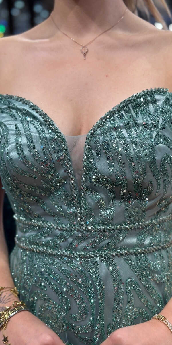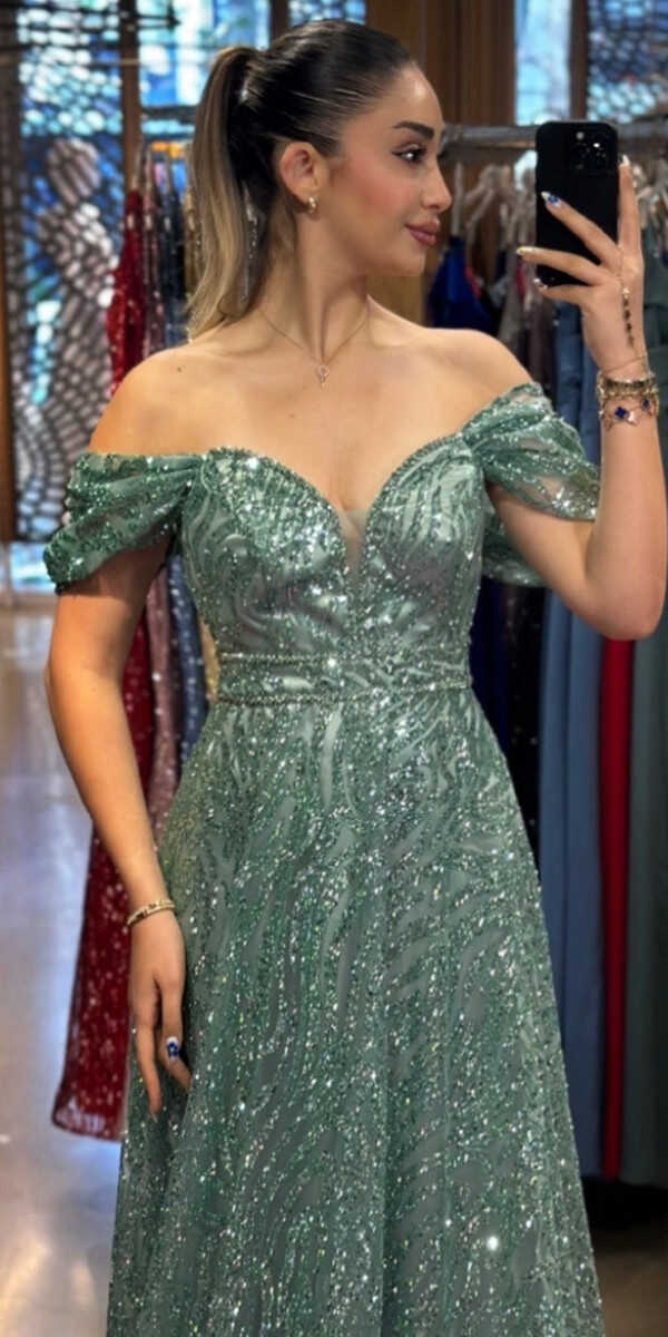 Mint Color Flared Skirt, Long Evening Dress, Has Been Produced From Glitter Fabric. You Will Look Very Beautiful With The Sparkle Of Glitter.