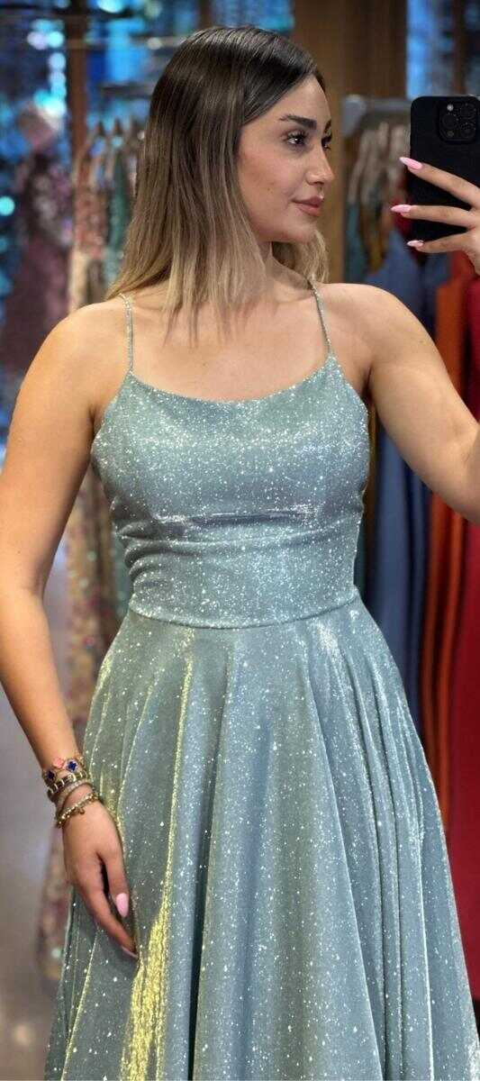 Mint Color Flared Skirt, Long Evening Dress, Has Been Produced From Glitter Fabric. Rope Hangers On The Dress Will Create Ease Of Use. Stylish Low-Cut Back Dress Will Look Great On You. You Will Look Very Beautiful With The Sparkle Of Glitter.
