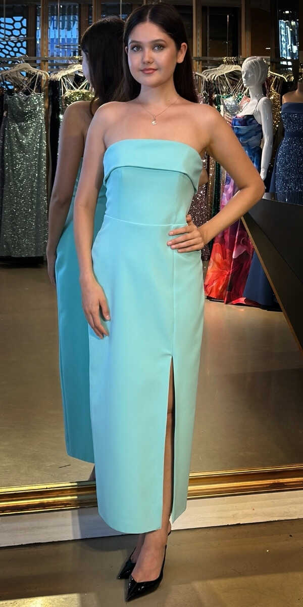 Mint Renk Düz Kesim Midi Abiye Elbise, Krep Kumaştan Üretilmiş olup Hafif Ve Daha Az Kırışan Krep Kumaş Sizi Daha Rahat Hissettirecektir. Yırtmaç Detayı Cesur ve Çarpıcı Bir Stil Sunacaktır.
