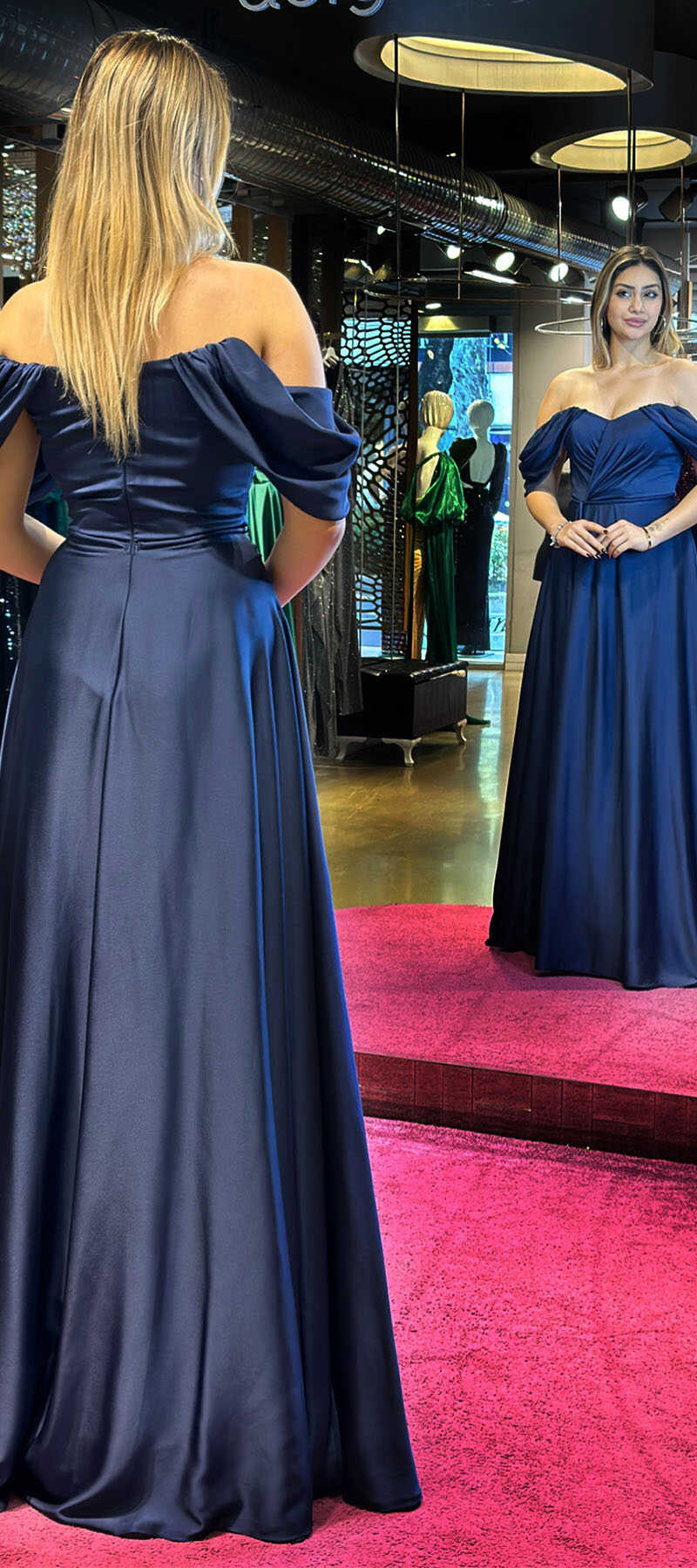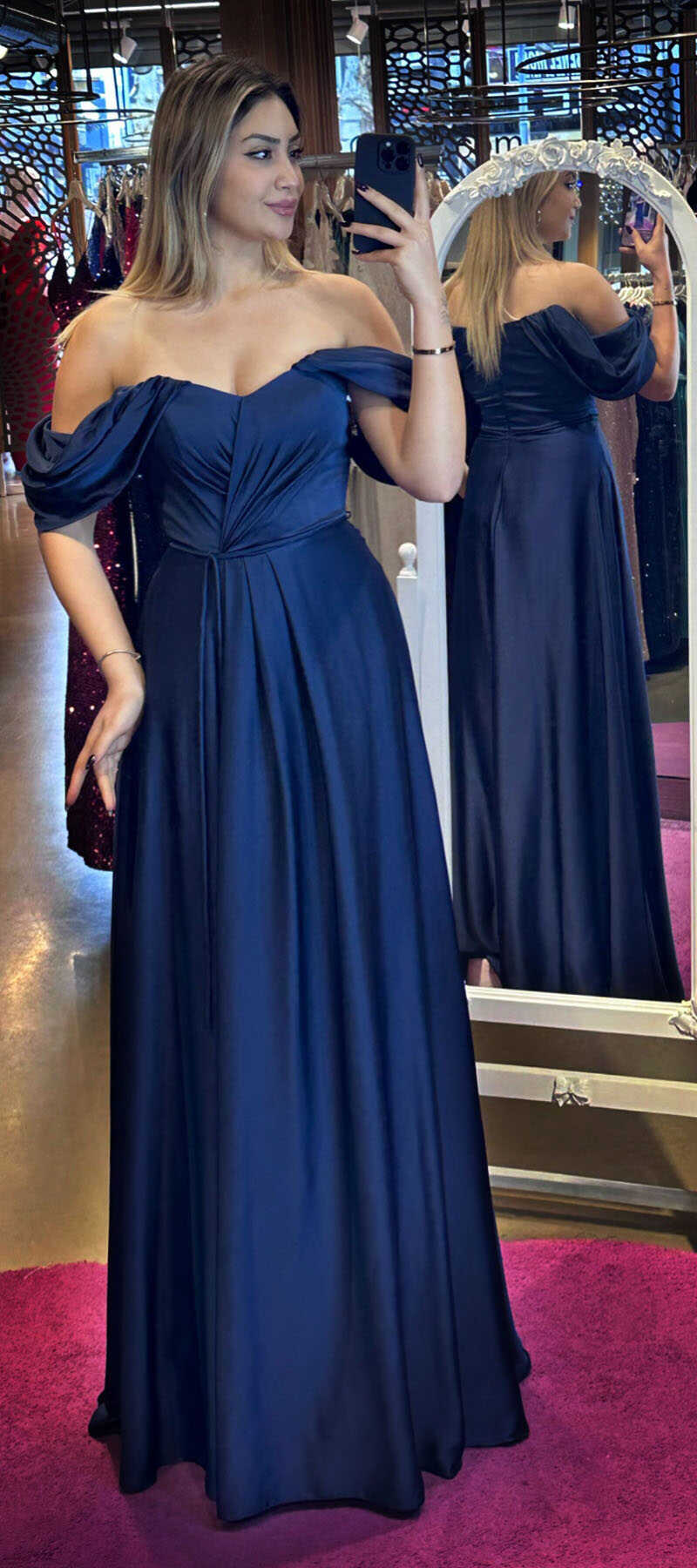Navy Blue Color Flared Skirt, Long Evening Dress, Has Been Produced From Satin Fabric. The Smooth Light Of Satin Will Add Elegance To Your Look.
