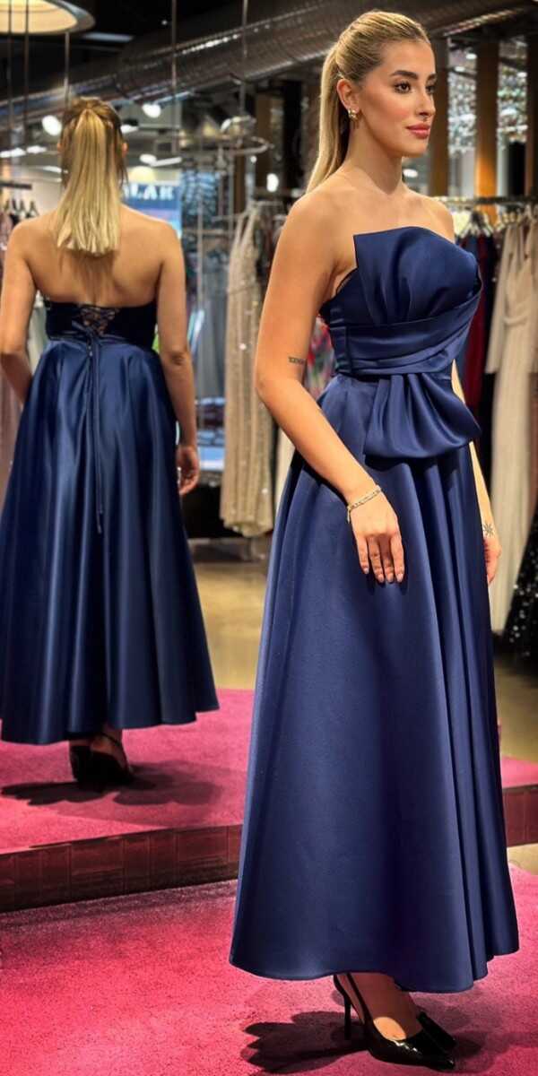 Navy Blue Color Flared Skirt, Midi Evening Dress, Has Been Produced From Satin Fabric. The Smooth Light Of Satin Will Add Elegance To Your Look.