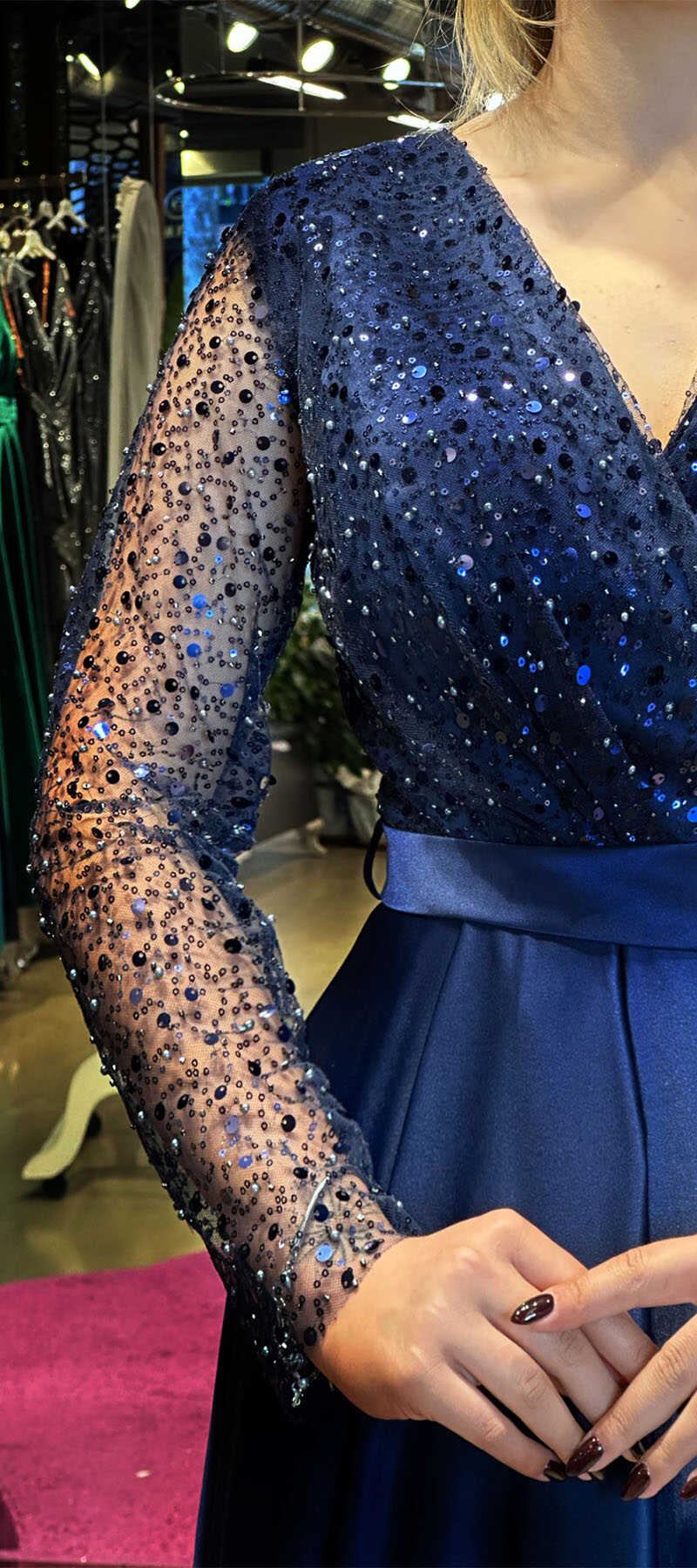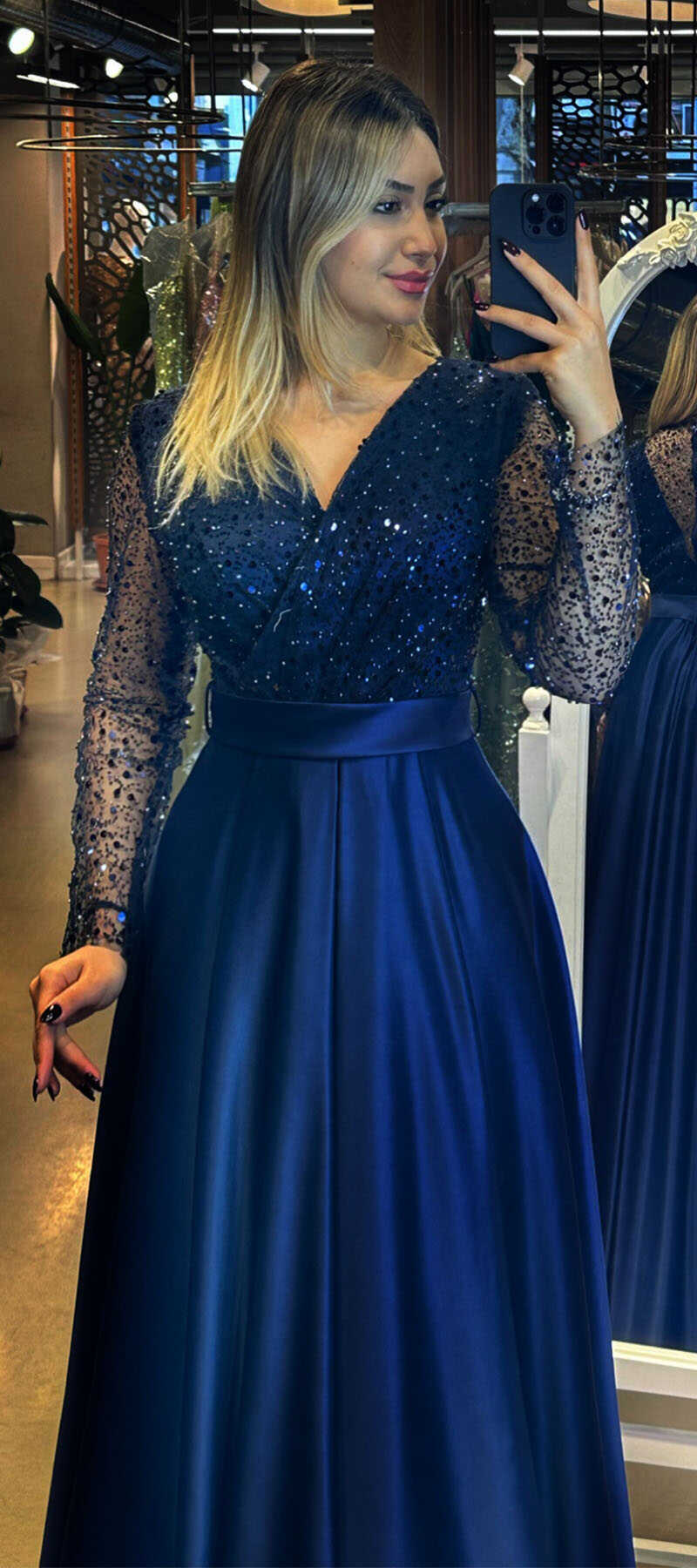 Navy Blue Color Flared Skirt, Long Evening Dress, Has Been Produced From Satin Fabric. The Smooth Light Of Satin Will Add Elegance To Your Look.
