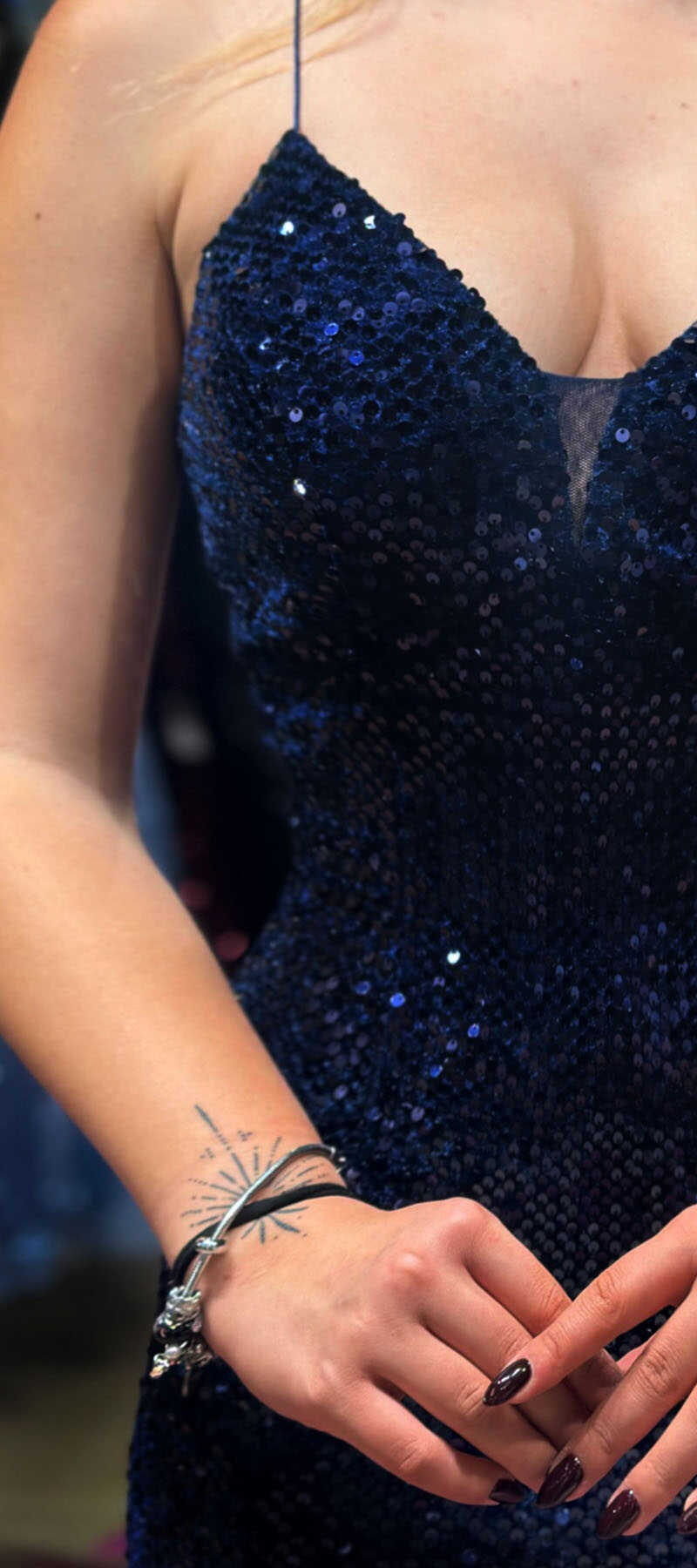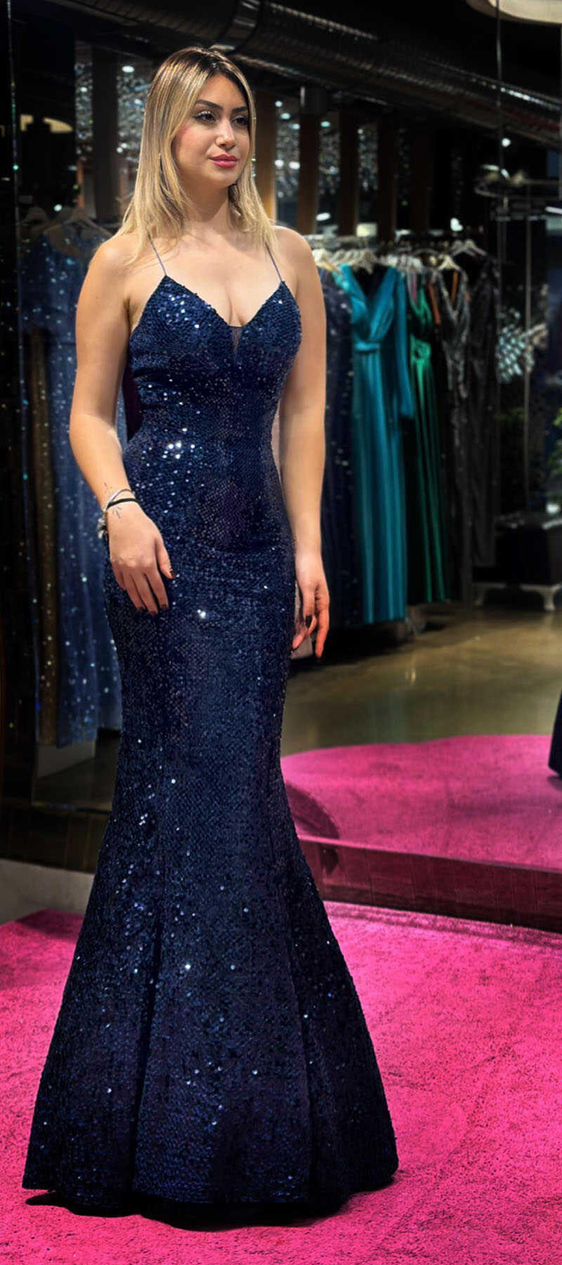 Navy Blue Color Mermaid Skirt, Has Been Produced From Velvet Sequin Fabric. Rope Hangers On The Dress Will Create Ease Of Use. Stylish Low-Cut Back Dress Will Look Great On You. This Type Of Fabric Which Is Specially Woven With A Fishing Line On Velvet Fabric Will Wrap Your Body And Make You Look Thinner Than You Are, In Addition To Its Remarkable Shine.