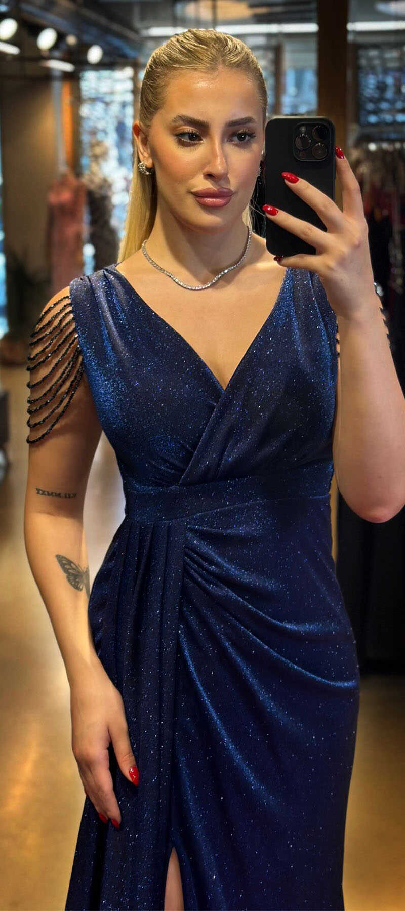 Navy Blue Color Straight Cut, Long Evening Dress, Has Been Produced From Glitter Fabric Fabric. Slit Detail Will Present A Brave And Striking Style.