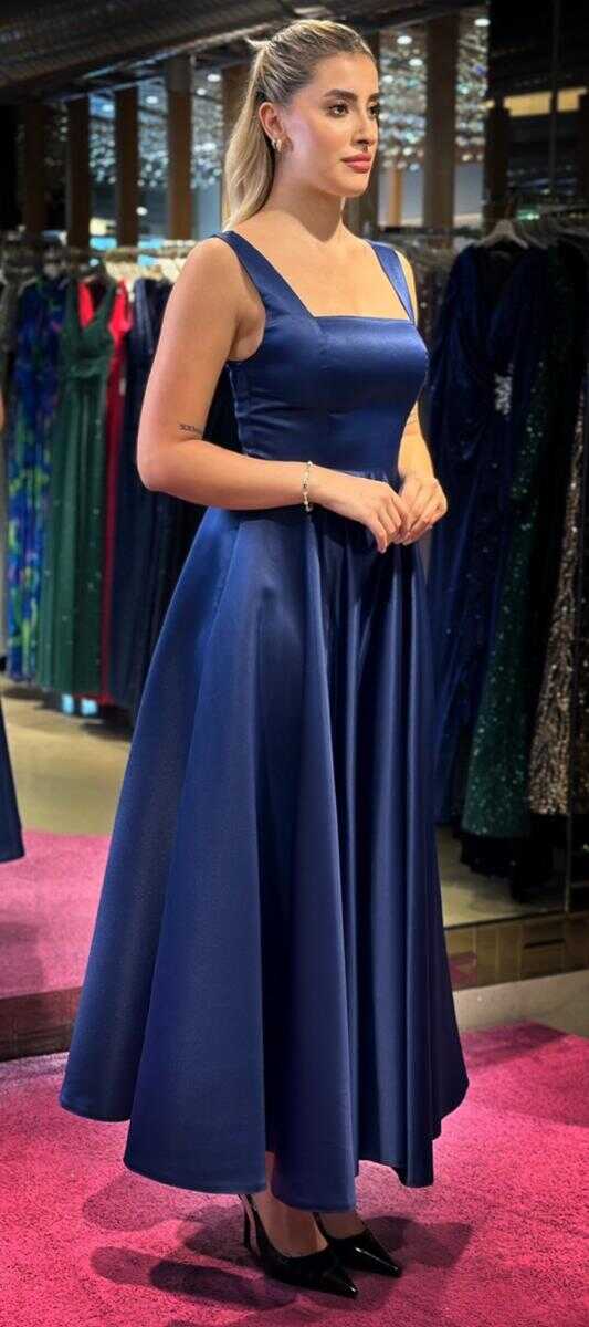 Navy Blue Color Flared Skirt, Midi Evening Dress, Has Been Produced From Satin Fabric. The Smooth Light Of Satin Will Add Elegance To Your Look.