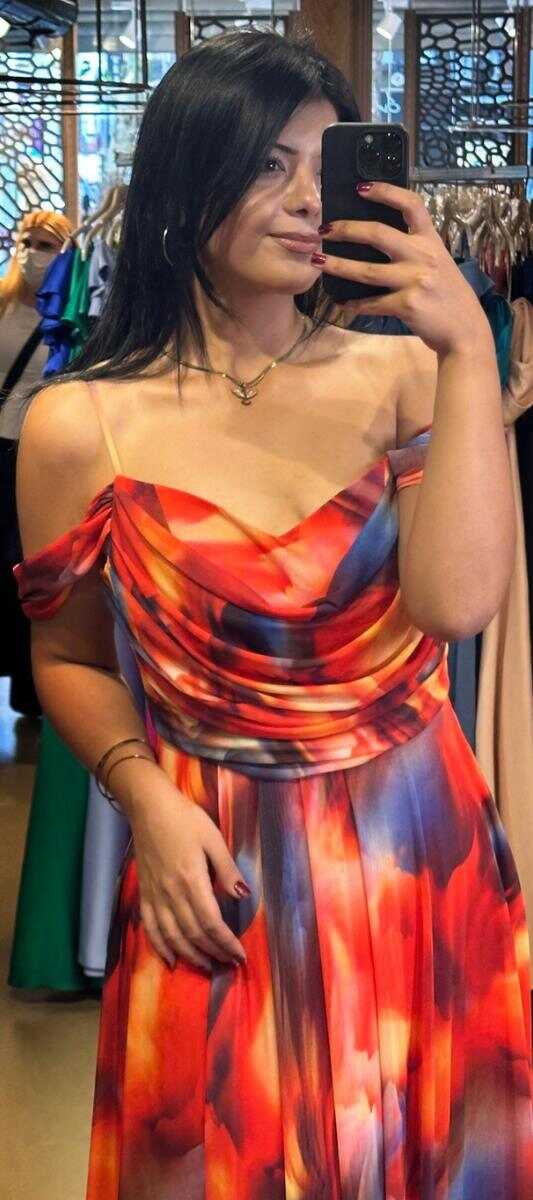 Orange Color Flared Skirt, Long Evening Dress, Has Been Produced From Patterned Fabric. Rope Hangers On The Dress Will Create Ease Of Use. Stylish Low-Cut Back Dress Will Look Great On You. It Will Be Indispensable For Your Beach And Countryside Weddings.
