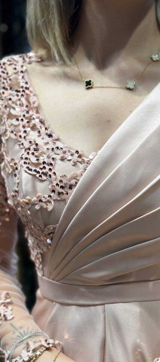 Powder Color Flared Skirt, Long Evening Dress, Has Been Produced From Satin Fabric. Lace Detail Will Dazzle With Its Glitter. The Smooth Light Of Satin Will Add Elegance To Your Look.