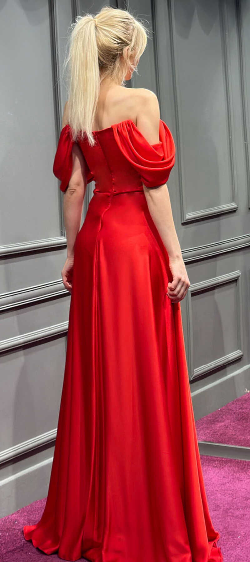 Red Color Flared Skirt, Long Evening Dress, Has Been Produced From Satin Fabric. The Smooth Light Of Satin Will Add Elegance To Your Look.
