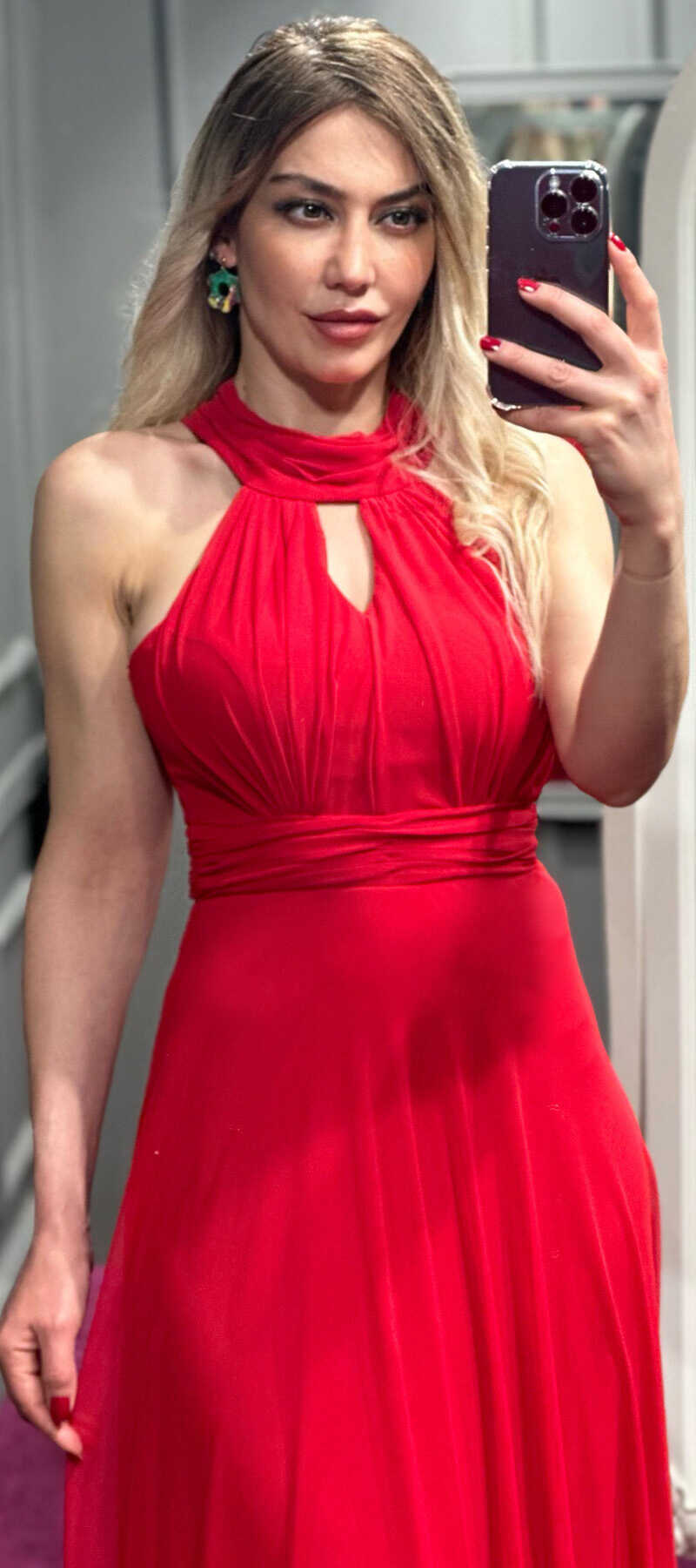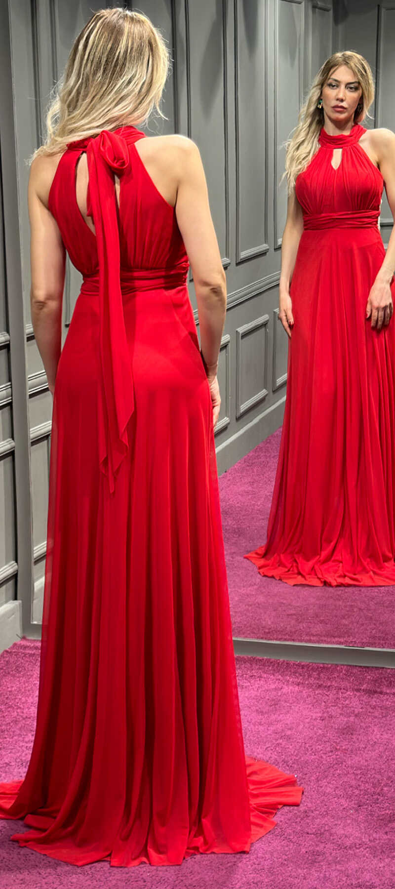 Red Color Flared Skirt, Long Evening Dress, Has Been Produced From Tulle Fabric. Stylish Low-Cut Back Dress Will Look Great On You. It Will Make You Feel Comfortable All Night Long Because It Is Light.