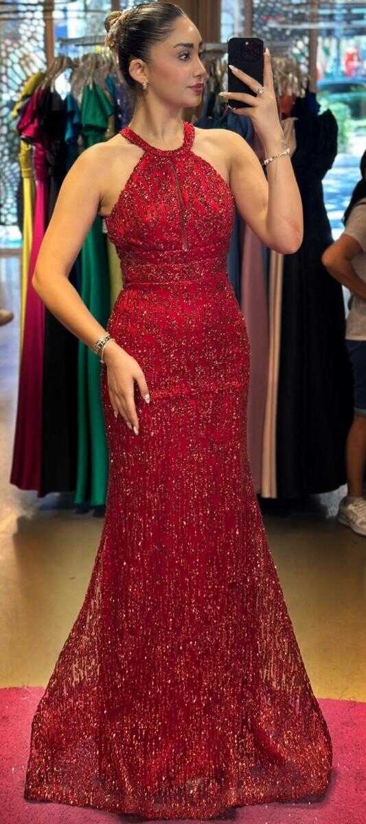 Red Color Mermaid Skirt, Long Evening Dress, Has Been Produced From Glitter Fabric. You Will Look Very Beautiful With The Sparkle Of Glitter.