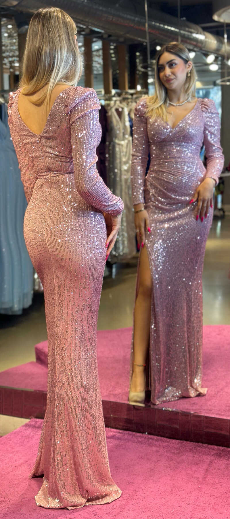 Rose Long Sleeve Slit Straight Cut Sequin Long Evening Dress 7321