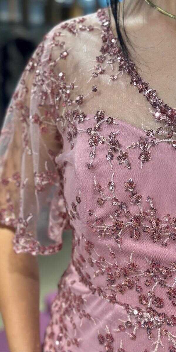 Rose Color Straight Cut, Long Evening Dress, Has Been Produced From Glitter Fabric. You Will Look Very Beautiful With The Sparkle Of Glitter.