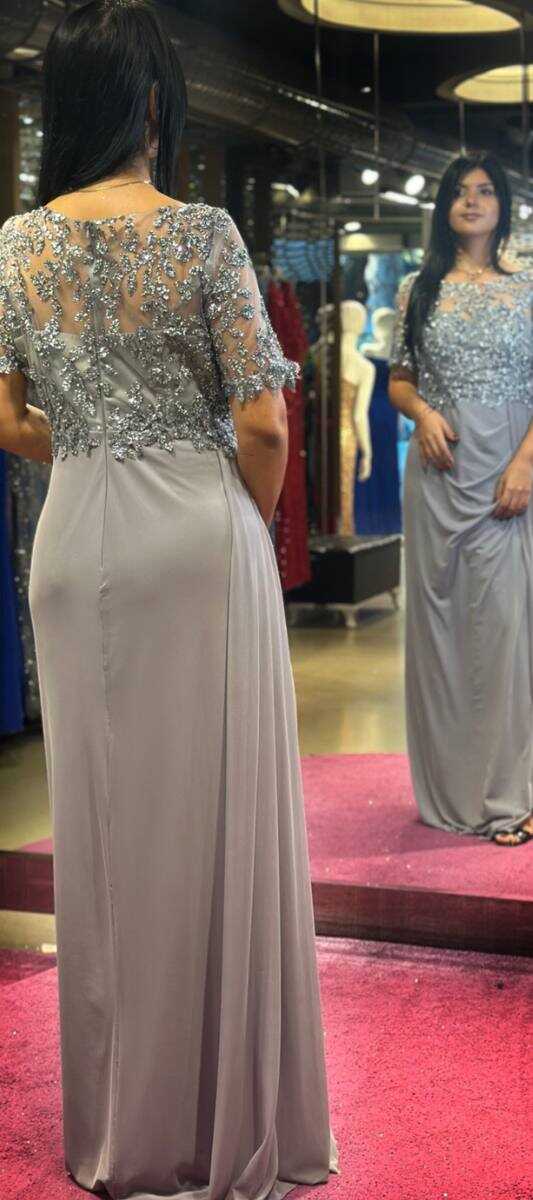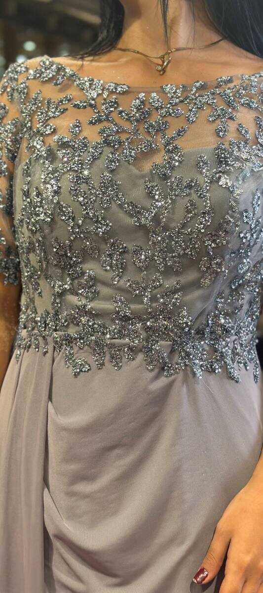 Silver Color Straight Cut, Long Evening Dress, Has Been Produced From Tulle Fabric. Slit Detail Will Present A Brave And Striking Style. It Will Make You Feel Comfortable All Night Long Because It Is Light.