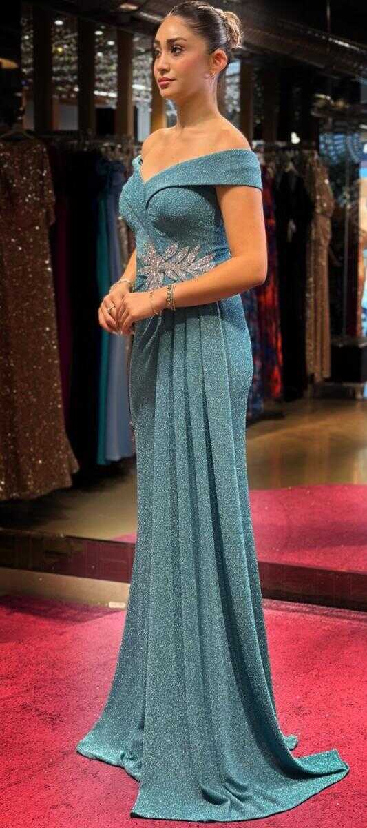 Turquoise Color Straight Cut, Long Evening Dress, Has Been Produced From Glitter Fabric. Stone Accessory Will Gather Attention On You. Slit Detail Will Present A Brave And Striking Style. You Will Look Very Beautiful With The Sparkle Of Glitter.