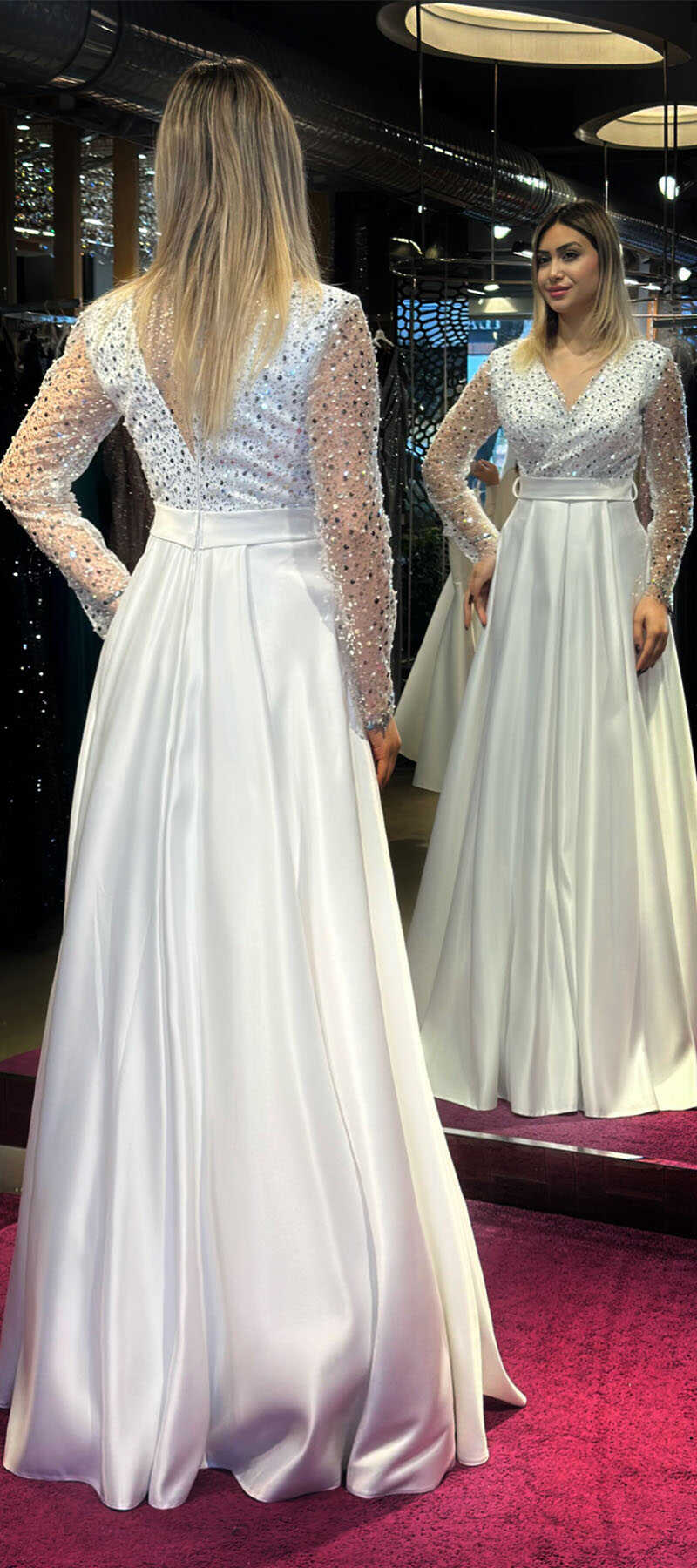 White Color Flared Skirt, Long Evening Dress, Has Been Produced From Satin Fabric. The Smooth Light Of Satin Will Add Elegance To Your Look.