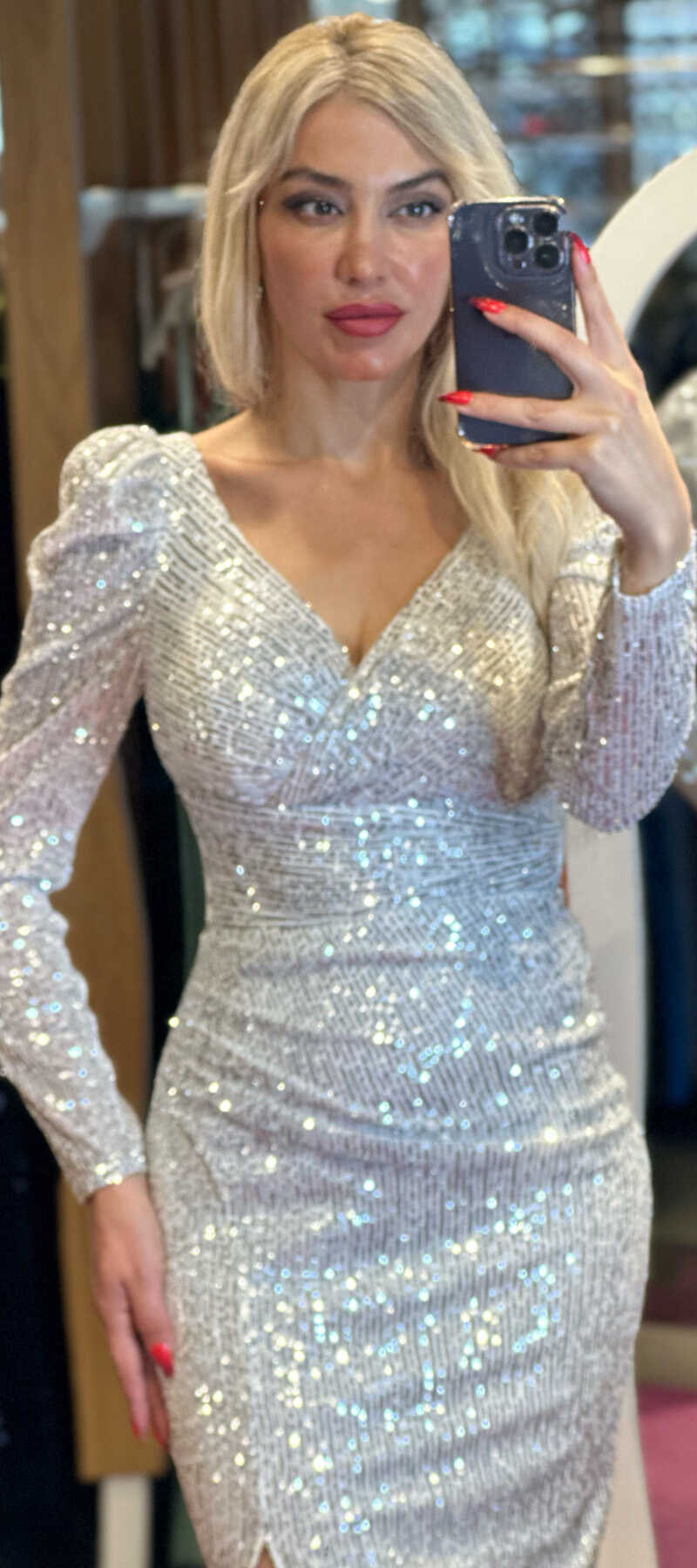 White Color Straight Cut, Short Evening Dress, Has Been Produced From Sequin Fabric. Slit Detail Will Present A Brave And Striking Style. It Will Dazzle With Its Sparkle.