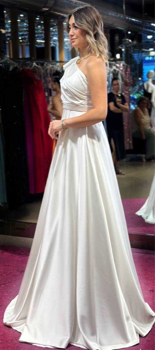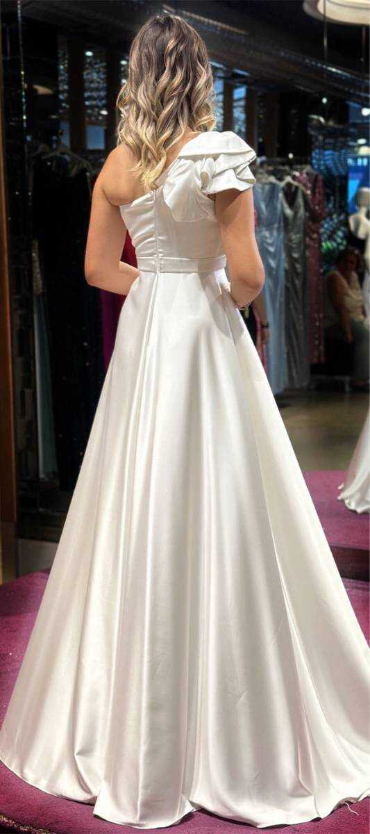White Color, Flared Skirt, Long Evening Dress, Has Been Produced From Satin Fabric. The Smooth Light Of Satin Will Add Elegance To Your Look.