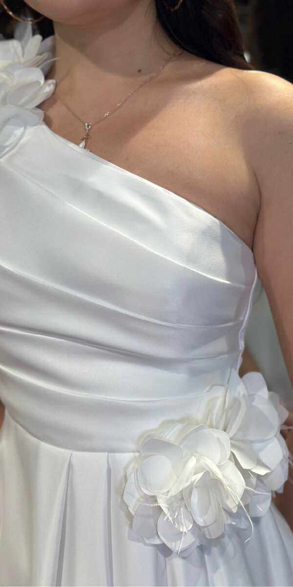 White Color Flared Skirt, Long Evening Dress, Has Been Produced From Satin Fabric. Flower Detail Will Create A Modern Look. The Smooth Light Of Satin Will Add Elegance To Your Look.