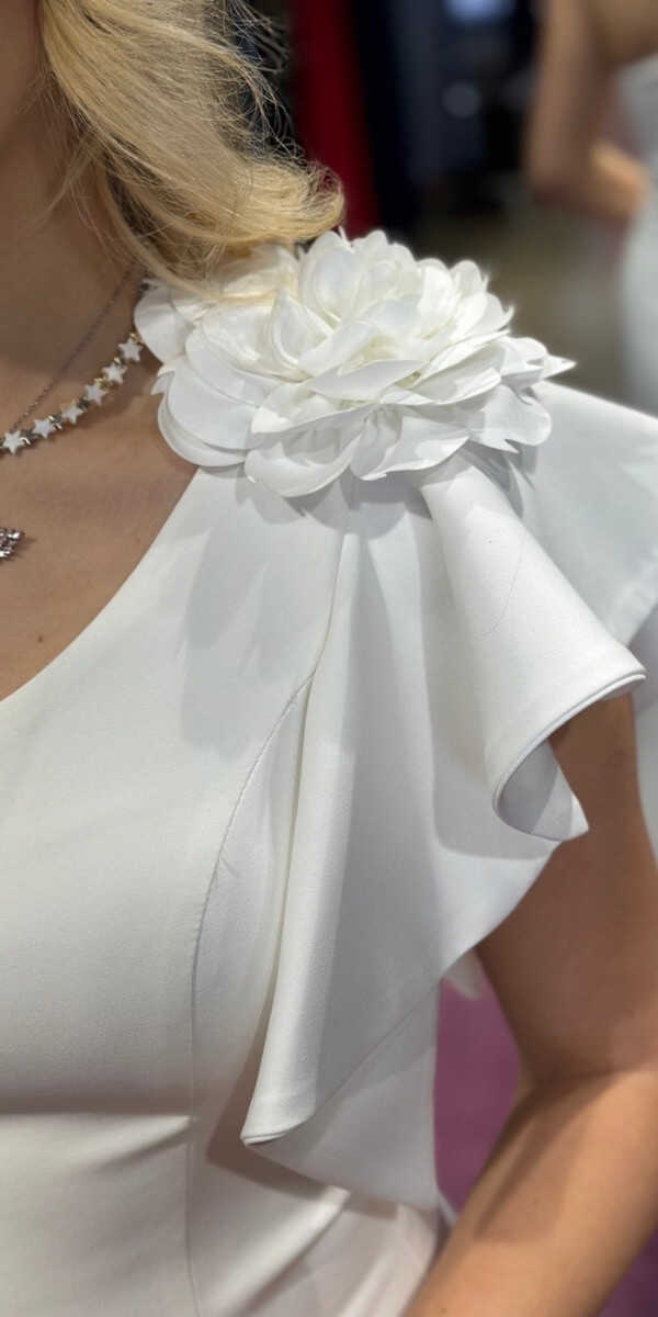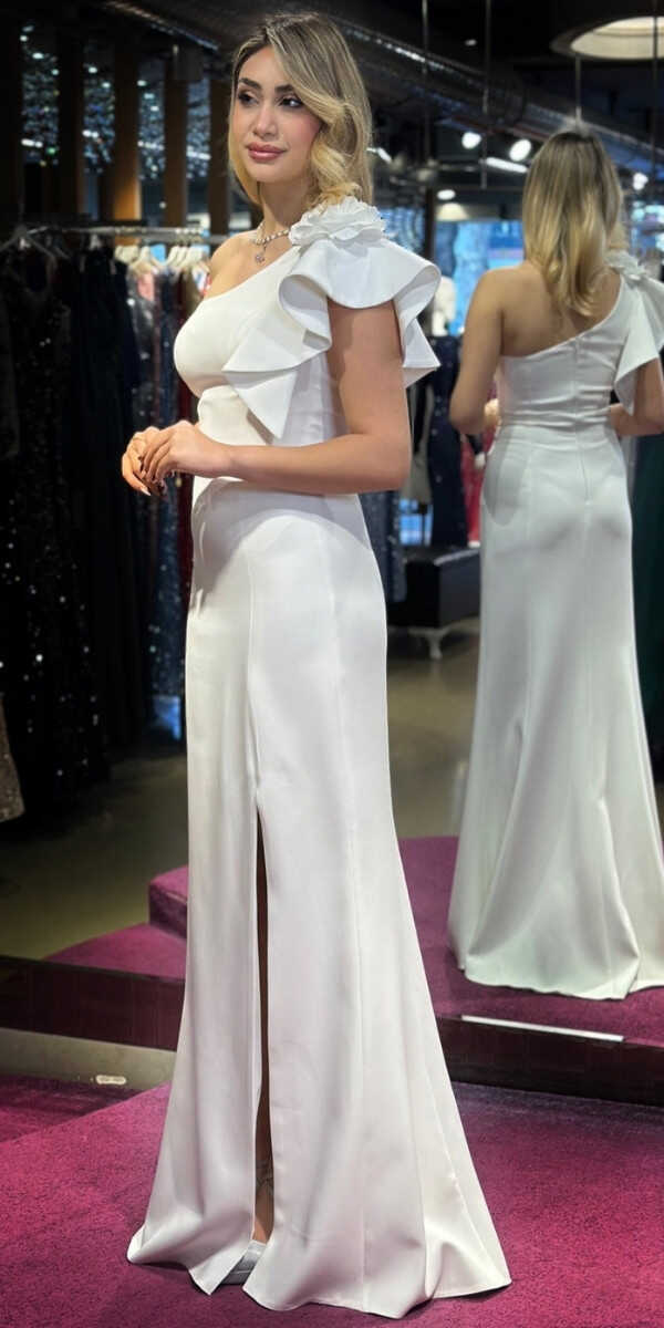 White Color Straight Cut, Long Evening Dress, Has Been Produced From Crepe Fabric. Flower Detail Will Create A Modern Look. Slit Detail Will Present A Brave And Striking Style. Lightweight And Less Wrinkled Crepe Fabric Will Make You Feel More Comfortable.