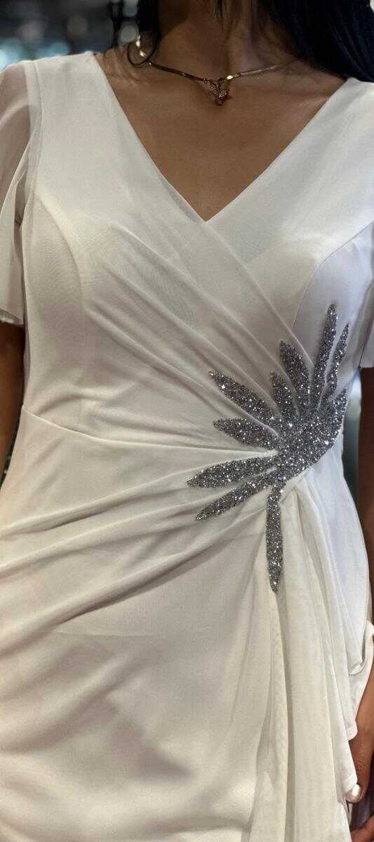 White Color Straight Cut, Long Evening Dress, Has Been Produced From Tulle Fabric. Stone Accessory Will Gather Attention On You. Slit Detail Will Present A Brave And Striking Style. It Will Make You Feel Comfortable All Night Long Because It Is Light.