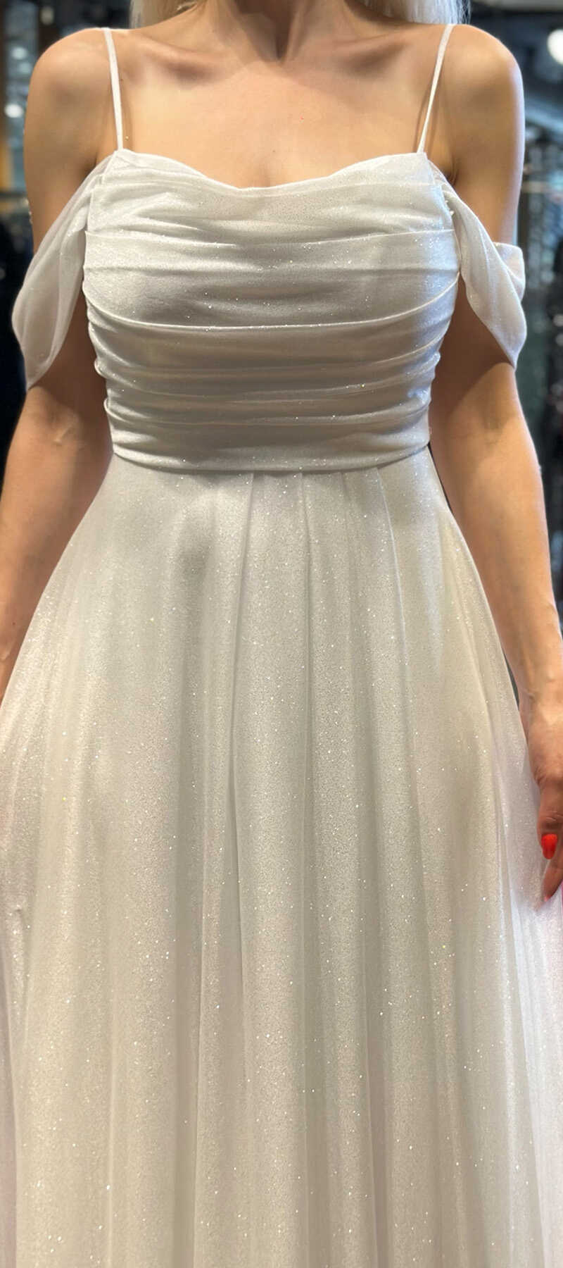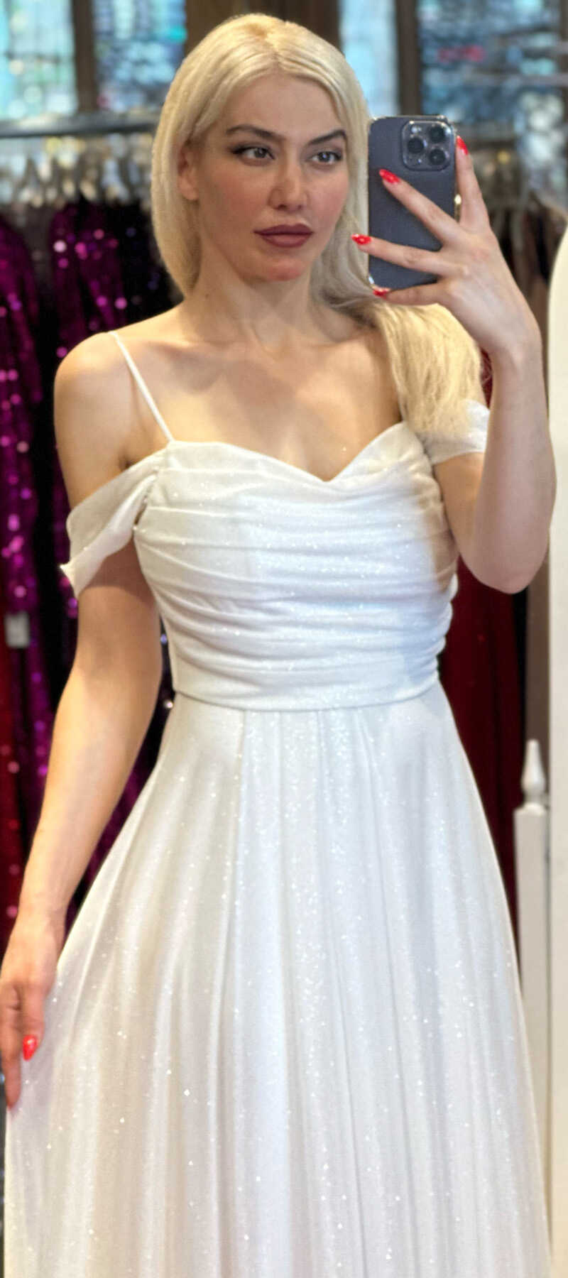 White Color Flared Skirt, Long Evening Dress, Has Been Produced From Glitter Fabric. Rope Hangers On The Dress Will Create Ease Of Use. Stylish Low-Cut Back Dress Will Look Great On You.