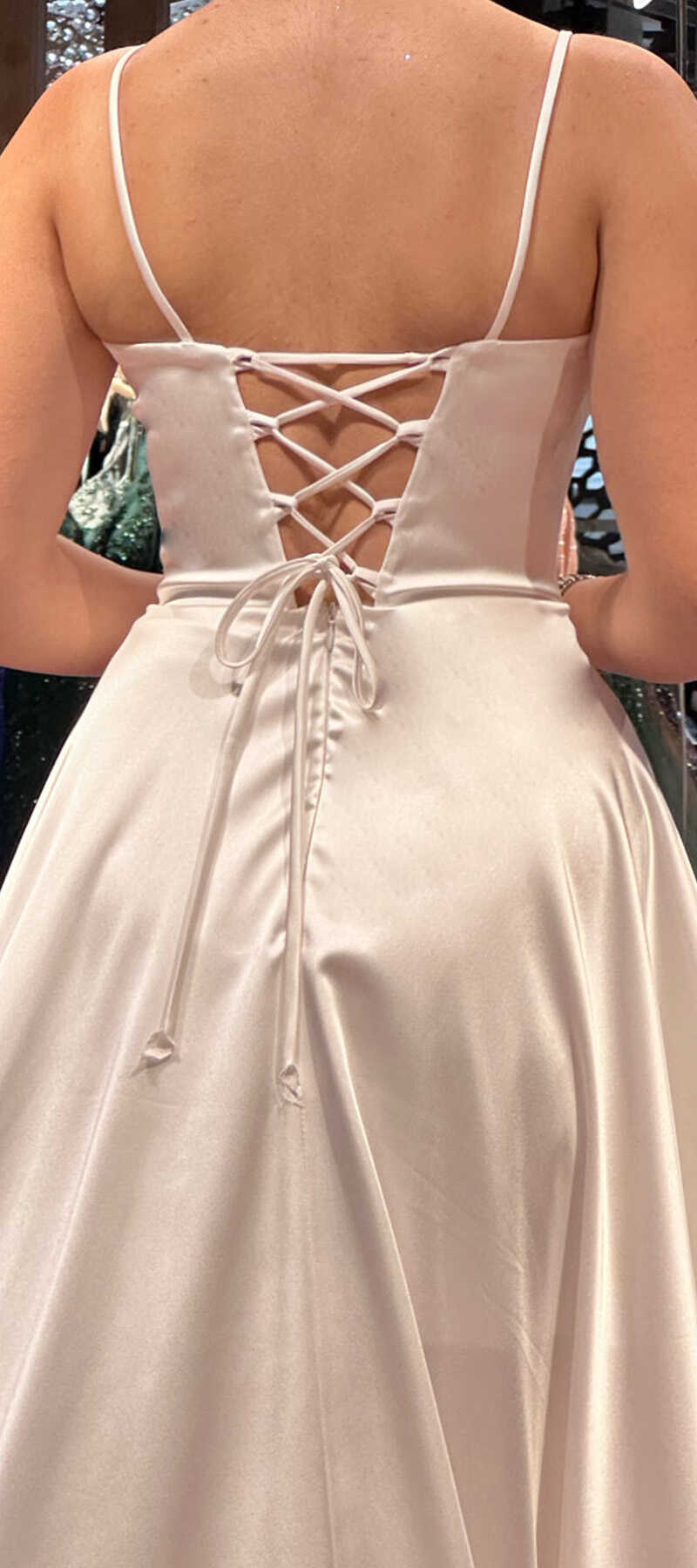 White Color Flared Skirt, Long Evening Dress, Has Been Produced From Satin Fabric. Rope Hangers On The Dress Will Create Ease Of Use. Stylish Low-Cut Back Dress Will Look Great On You. It Will Create A Dazzling Look. The Smooth Light Of Satin Will Add Elegance To Your Look.