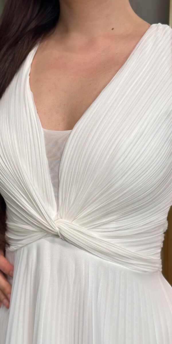 White Color Flared Skirt, Long Evening Dress, Has Been Produced From Fabric. Stylish Low-Cut Back Dress Will Look Great On You.
